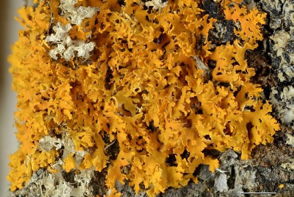 Description: Thallus foliose to subfruticose, heteromerous, dorsiventral, bright yellow to light orange, forming small to medium-sized, up to 3 cm wide tufts which often merge to cover larger surfaces. Lobes flattened to concave, slightly raised to ascending, 0.4-1 mm wide, smooth or slightly wrinkled, the tips with fine branchlets, with marginal to submarginal blastidia. Lower surface white, smooth to somewhat wrinkled, often with white, scattered rhizines. Upper and lower cortex paraplectenchymatous; medulla white. Apothecia very rare, lecanorine, laminal, stipitate, up to 3.5 mm across, with an orange disc and an often sorediate thalline margin. Thalline exciple paraplectenchymatous; proper exciple a strongly gelatinized plectenchyma with unoriented, short-celled hyphae; epithecium orange-brown, c. 10 µm high, K+ purple-red; hymenium colourless, 70-90 µm high; paraphyses simple or rarely branched, septate; hypothecium colourless or pale orange-brown, 25-40 µm high. Asci 8-spored, clavate, functionally unitunicate, apically thickened with a broad internal beak, the inner part of apex and external cap I+ blue, Teloschistes-type. Ascospores 2-celled, polarilocular, hyaline, ellipsoid, 16-17 x 7-9 µm, the equatorial thickening (“septum”) 6-7 µm. Pycnidia immersed, coloured as upper surface. Conidia variable, ellipsoid to bacilliform within the same pycnidium. Photobiont chlorococcoid. Spot tests: thallus and apothecia K+ purple-red, C-, KC-, P-, UV+ orange. Chemistry: parietin (major), fallacinal, emodin, teloschistin and parietinic acid (chemosyndrome A of Søchting 1997).