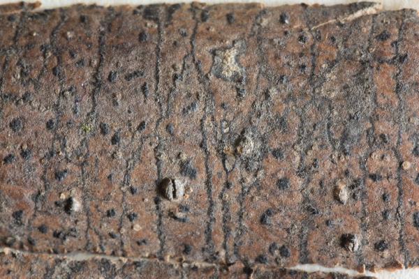 Description: Thallus crustose, not lichenized, endosubstratic, usually poorly evident, causing a slight bleaching of the bark. Ascomata perithecioid, immersed into 0.4–1.3 mm long, 0.2–0.65 mm wide, 100–200 μm thick, dark brown to black, irregularly shaped pseudostromata covered in an overlying, black wall which is not continuous below the hamathecium, with 1-4 globose to subglobose locules, each with a centrally located ostiole. Hamathecium of 2-3 µm thick, branched, rarely anastomosing, non-amyloid pseudoparaphyses. Asci 8-spored, bitunicate, broadly clavate to elongate-subglobose, with an ocular chamber, and occasionally with a short-pedicel. Ascospores 1-septate, slightly constricted at septum, hyaline, elongate-ellipsoid, 10-15(-17) x 3–4.5(-5) µm, the cells of unequal size. Spot tests: all negative. Chemistry: without lichen substances.Note: a mild-temperate fungus, most frequent on the smooth bark of Fraxinus ornus in the submediterranean belt.
