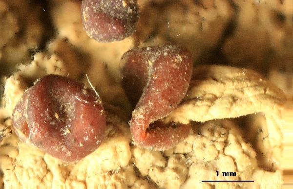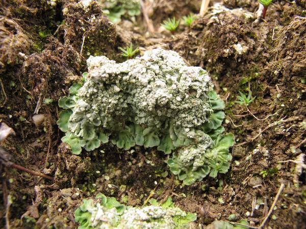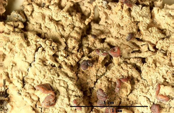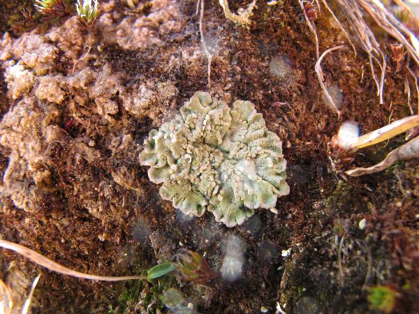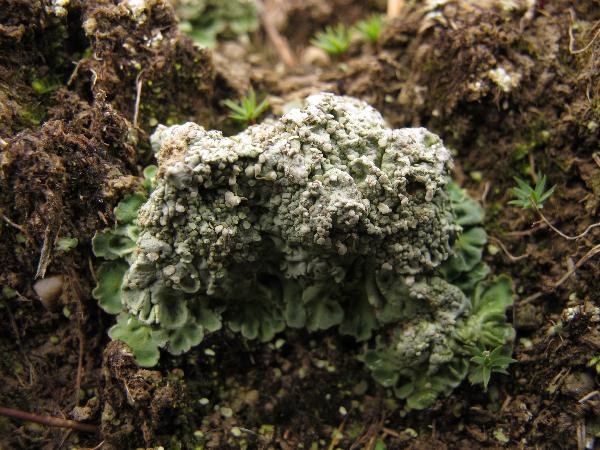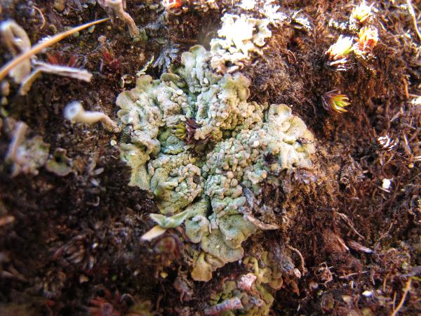 Description: Primary thallus crustose-placodioid, well-delimited, glaucous grey-green to brownish, turning bright green when wet, thick, forming up to 12 cm wide rosettes, the central parts subsquamulose, often covered in peltate, light-coloured, fragile, up to 0.6 mm wide schizidia leaving shallow scars when they fall off, the margins with radiating, up to 6 mm broad, flattened, contiguous, lobes which are often raised at tips. Apothecia frequent, biatorine, emarginate, with an ochraceous to reddish brown, flat, oftem narginally reflexed disc, up to 4(-5) mm across, terminal on furrowed, subfruticose, solid, up to 6 mm tall and to 2 mm thick stipes which are corticate and sometimes microsquamulose in lower part. Epithecium yellowish brown, C+ red; hymenium colourless, 70-120(-150) µm high, K/I-; paraphyses 2-2.5 µm thick at mid-level, slender, simple or sparingly branched towards the tips, not anastomosing, the apical cell c. 3 µm wide; hypothecium pale. Asci 8-spored, cylindrical, thin-walled, the apex truncated, with a single functional wall layer, with a poorly differentiated, non-amyloid tholus. Ascospores 1(-2)-celled, hyaline, fusiform, 8-14(-16) x (2-)3-4(-5.5) µm. Photobiont chlorococcoid. Spot tests: thallus K+ yellow, C-, KC+ orange, P+ orange, UV+ pale yellow; mature apothecia C+ red. Chemistry: thallus with the stictic acid complex, incl. traces of norstictic acid and an unidentified substance; gyrophoric and lecanoric acids in mature apothecia. Note: an arctic-alpine to boreal-montane, probably circumpolar lichen found on sandy-clay soil in open stands (e.g. montane-subalpine grasslands), often in moderately disturbed habitats, sometimes reaching the Alpine belt. Probably restricted to the Alps in Italy.