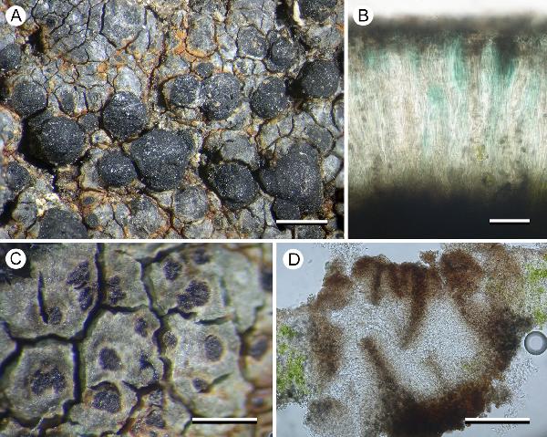 Description: Thallus crustose, thinly episubstratic, continuous to weakly rimose, creamy white to partially pale greyish orange, somehow shiny, sometimes poorly evident. Medulla white, I-. Apothecia lecideine, black, (0.2-)0.5-1.2(-2.5) across, usually scattered, round to irregular in outline, at first immersed but soon becoming sessile, with a slightly concave to slightly convex (mostly flat) rarely whitish-pruinose disc, and a thick, prominent, often crenulate proper margin. Proper exciple with a dark, carbonaceous cortex and a much paler, pale brown interior composed of 2-4 µm thick, filamentous hyphae; epithecium bright emerald green, 12-25 µm high; hymenium colourless or blue-green in upper part, 80-140 µm high; paraphyses coherent, richly branched and anastomosing; hypothecium dark. Asci 8-spored, elongate-clavate, with a thin, outer amyloid layer and a thickened tholus penetrated by a pore, the sides of which are strongly amyloid, Porpidia-type. Ascospores 1- celled, hyaline, ellipsoid, (14-)17-25 x 5.5-10 µm. Pycnidia usually very abundant. Conidia bacilliform, (8-)9-12 µm long. Photobiont chlorococcoid. Spot tests: cortex and medulla K-, C-, KC-, P-. Chemistry: thallus without lichen substances; epithecium with the Cinereorufa-green pigment. Note: a species of semi-inundated siliceous rocks, often found along creeks; rare throughout Europe, most frequent in Western Europe at low elevations, with a few records from the Eastern Alps (Austria). To be looked for in Italy.