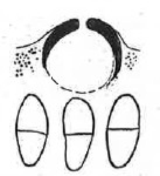Description: Thallus crustose, thinly episubstratic, continuous to finely rimose, grey-white to olive-green, subgelatinous when wet, proso- or paraplectenchymatous, ecorticate, without a dark basal layer; photobiont cells irregularly arranged. Perithecia scattered, black, 0.2-0.3 mm across, forming hemispherical projections. Involucrellum absent; exciple globose, black and thicker in upper part, pale brown to colourless in lowermost part; hamathecium of up to 30 µm long periphyses and periphysoids, interascal filaments absent; hymenial gel I+ red (I+ blue at very low concentrations of I), K/I+ blue. Asci 8-spored, ellipsoid to clavate, I-, fissitunicate, the wall thickened above, with an ocular chamber, dehiscent by extrusion of a delicate rostrum,67-93 x 26-40 µm. Ascospores 1-septate, hyaline, ellipsoid, (13-)21-28(-31) x (7-)9-13(-15) μm. Photobiont chlorococcoid. Spot tests: K-, C-, KC-, P-, UV-. Chemistry: without lichen substances.