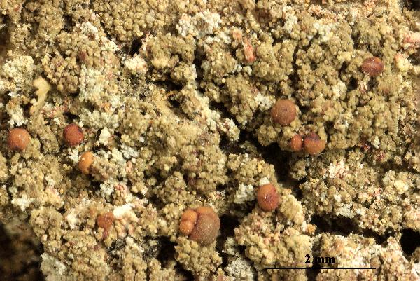 Description: Thallus crustose, episubstratic, 0.2-0.4 mm thick, bright green to dark green (turning brownish in the herbarium), matt, granular-verrucose to minutely subsquamulose, forming up to 10 cm wide partches; verrucae/squamules small, 0.1-0.2(-0.3) mm in diam., convex, densely crowded and frequently overlapping, rarely finely dissected, dissolving into poorly delimited, 0.3-0.7 mm wide soralia, the soredia 20-40 μm across, sometimes gathered into 30-90 μm wide consoredia. Apothecia biatorine, rounded, sessile, strongly constricted at base, 0.3-0.7(-1.2) mm across, with a beige to reddish brown, strongly convex, epruinose disc, and an indistinct, slightly paler, soon excluded proper margin. Proper exciple colourless, 35-90 μm wide laterally, 100-280 μm wide basally, of radiating, weakly branched and anastomosing hyphae with cylindrical, 1-2.5 μm wide lumina, the lumina of apical cells up to 3 μm wide; epithecium scarcely differentiated from the hymenium; hymenium colourless or pale yellow, 40-55 μm high; paraphyses simple or sparingly branched and anastomosing, 1-1.5 μm thick at mid-level, the apical cells 1.5-3.5 μm wide; subhymenium distinct, colourless to yellowish brown, 50-95 µm high; hypothecium colourless to pale yellow-brown, 145-250 µm high. Asci 8-spored, clavate, with a K/I+ blue apical dome penetrated by a narrow, K/I- apical cushion surrounded by a narrow, deeply K/I+ blue zone, the wall K/I- but surrounded by an I+ red-brown, K/I+ blue outer layer, the ocular chamber relatively small, Biatora-type, 29-45 x 6-10 µm. Ascospores 1-celled or rarely 1-septate, hyaline, ellipsoid, (8.5-)11-14(-19.5) x (3-)3.7-4.5(-5.5) μm. Photobiont chlorococcoid. Spot tests: thallus K-, C- or (especially the soralia) C+ fleeting pink, P+ orange-red. Chemistry: thallus with gyrophoric acid and argopsin (major), and norargopsin (traces). Note: on the base of coniferous trees near treeline; most records from the Alps are historical.