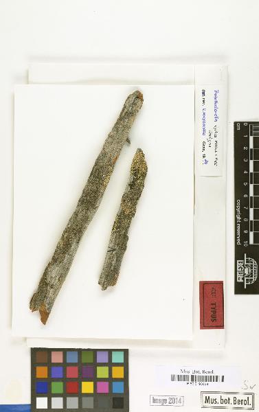 Description: Thallus crustose, often poorly evident, bright green, consisting of a few algal cells surrounded by hyphae, especially around the perithecia. Perithecia brown-black when dry, paler but always with a dark, finally broad ostiole when wet, globose to weakly pyriform, 0.15-0.25(-0.3) mm across, at least half-immersed in the thallus, covered with a thin colourless layer in lower part. Exciple brown in upper part, paler in lower part, of strongly anastomosing, conglutinate, to 1 μm thick hyphae with narrow lumina; paraphysoids persistent, thread-like, 0.7-1 μm thick, branched and anastomosing in lower part; periphysoids absent; hymenial gel I+ reddish or I+ blue at low concentrations, K/I+ blue. Asci 8-spored, narrowly cylindrical, short-stalked, thick-walled (2-3 μm), fissitunicate, the outer gelatinous wall layer I+ blue, with a very faintly I+ blue apical plug. Ascospores submuriform to muriform, with 3-5 tranverse septa and 1-2 longitudinal septa, hyaline, ellipsoid-oblong, (19-)24-32 x 10-14 μm, often attenuated at both ends. Photobiont chlorococcoid (Elliptochloris), the algal cells surrounded by a gelatinous sheath. Spot tests: K-, C-, KC-, P-, UV-. Chemistry: without lichen substances. Note: a species resembling P. sphinctrinoidella, but with an inconspicuous endoxylic thallus, and broader ascospores. growing on wood of Pinus cembra in the subalpine belt; rare in Central Europe, with a few records from the Alps (Switzerland, Austria); to be looked for in the Italian Alps.