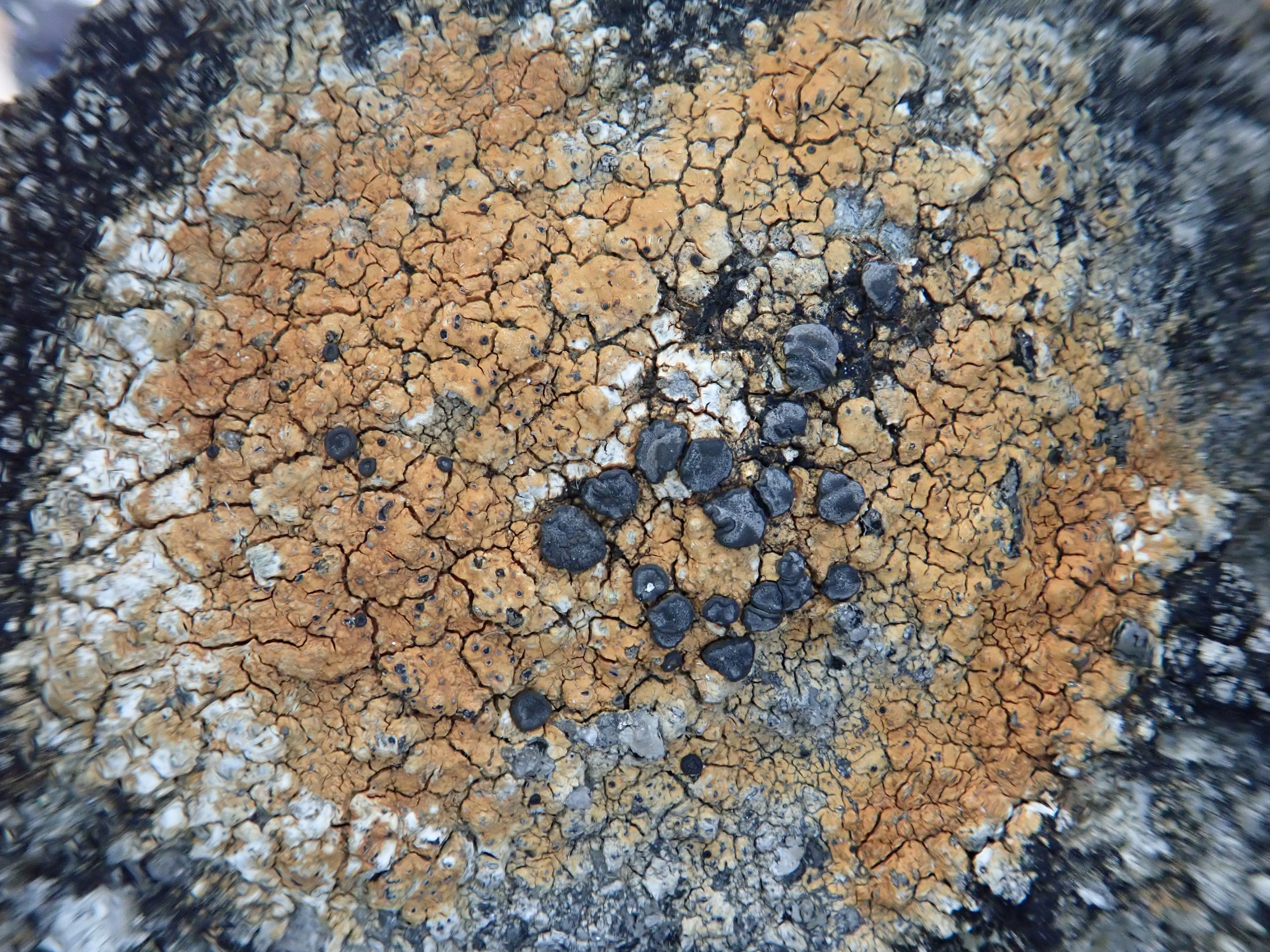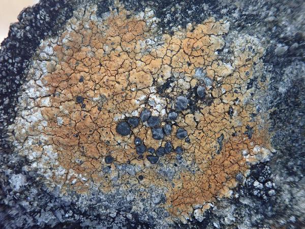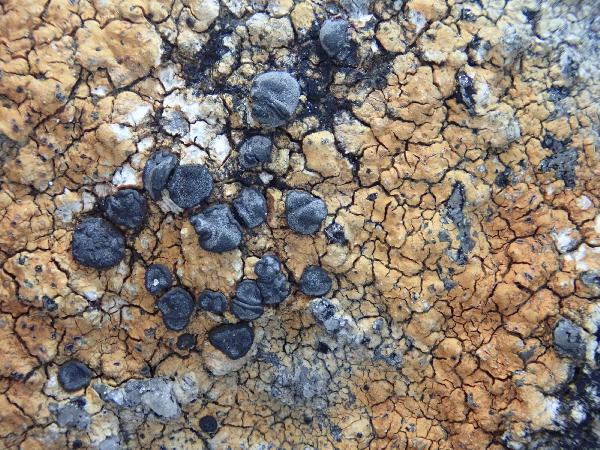 Description: Thallus crustose, episubstratic, 0.1-0.2 mm thick, yellow-orange to yellow-brown, continuous to often irregularly cracked-areolate, with low warts from which the apothecia arise, usually delimited by a black prothallus. Medulla I-. Apothecia lecideine, (0.8-)1.2-1.5(-2.5) mm across, black, sessile and slightly constricted at base, with a flat to slightly convex, rarely umbonate, often weakly grey- or orange-pruinose disc and a raised, persistent, c. 0.1 mm thick proper margin. Proper exciple of radiating hyphae, the outer rim blue-black, 17-25 μm wide, of globose, 6-12 μm wide cells, K+ crimson (solution), N+ red, the inner part orange-brown, of 3-4(-5) μm wide cells, K+ crimson or rarely K-, N-; epithecium pale olivaceous, K-, N+ orange-red, sometimes blue-green in lower part; hymenium colourless, 135-150 μm high, I+ blue; paraphyses coherent, branched and anastomosing, 1-1.5 μm thick at mid-level, with scarcely swollen apical cells; subhymenium colourless, c. 50 μm high; hypothecium dark brown, c. 100 μm high, K–, N-. Asci 8-spored, elongate-clavate, with a thin, outer amyloid layer and a thickened tholus penetrated by a pore, the sides of which are strongly amyloid, Porpidia-type. Ascospores 1-celled, hyaline, ellipsoid, (13-)15-19 x (7-)8-10 μm, rather thin-walled, with a narrow perispore. Pycnidia black, innate to sessile, often surrounded by a thalline layer. Conidia simple, bacilliform, 10-14 x c. 0.8 μm. Photobiont chlorococcoid. Spot tests: cortex and medulla K-, C-, KC-, P-, UV-, K/UV-. Chemistry: thallus without lichen substances.Note: on siliceous boulders and low outcrops; widespread in Europe and also known from Alaska, with a few records from the Eastern Alps (Austria), mostly near treeline. To be looked for in the Italian Alps