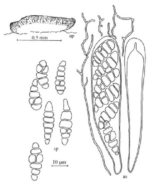 Description: Thallus crustose, very thinly episubstratic, smooth, grey-green, sometimes poorly evident. Apothecia round, 0.8-0.9 mm across, strongly constricted at base, with a brown, initially urceolate, finally flat to slightly convex disc and a thin proper margin. Proper exciple of a loose network of thin, anastomosing hyphae embedded in a gelatinous matrix; epithecium brownish; hymenium colourless, 80-90 µm high, I-; paraphyses richly branched and anastomosing in upper part, c. 1 µm thick; hypothecium colourless. Asci 4-6-spored, up to 70 µm long, cylindrical-clavate, thin-walled, apically thickened, the contents K/I+ reddish. Ascospores submuriform, with (4-)5(-6) transverse septa and a single longitudinal septum, constricted at septa, hyaline, elongate-fusiform, 15-25 x 5-8 µm, with a poorly evident gelatinous perispore. Photobiont chlorococcoid. Spot tests: thallus K-, C-, KC-, P-, UV-. Chemistry: without lichen substances.