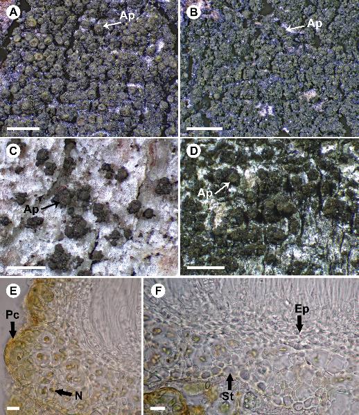 Rostania effusa (A, UPS L-611182; B, UPS L-088894; C, UPS L-656297; D, UPS L-929096—holotype; E & F, S F388734). A, habitus – granular thallus with an unusually large number of apothecia (Ap); note the small globose thallus granules. B, habitus – granular thallus dominated by small blastidia-like granules with apothecia (Ap). C, habitus – granular thallus forming small, scattered patches with apothecia (Ap). D, habitus – granular thallus forming scattered patches with apothecia (Ap). E, section of apothecium; note the excipulum thallinum with a simple pseudocortex (Pc) and Nostoc as single cells or 2–4 cells in clusters (N). F, section of apothecium; note the supporting tissue (St) formed by a single layer of rounded to ellipsoid cells and the euthyplechtenchymatous excipulum proprium (Ep). Scales: A–D = 1 mm; E & F = 10 μm.