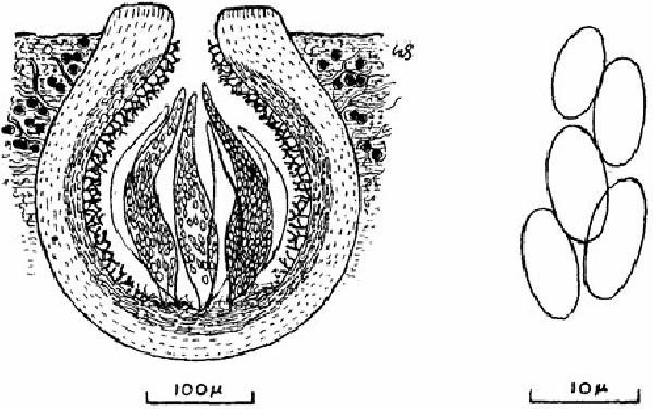 Description: Thallus crustose, not lichenized, very thin and film-like, inconspicuous when dry but forming greenish spots when wet, the hyphae c. 0.5-0.75 μm thick, forming a loose network among soil particles in lower part and enclosing chlorococcoid algae in upper part. Ascocarps perithecioid, globose, (0.25-)0.3-0.42 across, fully to 3/4 immersed in soil, the 0.1-0.15 mm wide, dark brown to black apical part emerging. Exciple colourless in outer part, pale pink-brown in inner part, (35-)40-45(-50) μm thick, devoid of algae; paraphyses absent; periphyses simple or sparingly branched, (20-)27-30(-35) μm long, perpendicular to the uppermost part of the exciple; hymenial gel I–. Asci 200-300-spored, the wall I+ pale blue. Ascospores simple, hyaline, oblong, (5.5-)7-12(-14) x (2.5-)4-5.5(-6.3) μm. Photobiont chlorococcoid. Spot tests: K-, C-, KC-, P-. Chemistry: without lichen substances.Note: an ephemeral, pioneer terricolous lichen growing on clay to loamy soil in open situations, with a scattered distribution from Western Europe to Russia, but very easy to overlook. To be looked for in Italy.