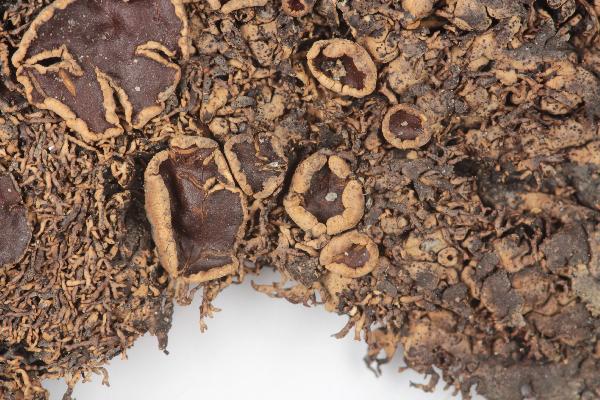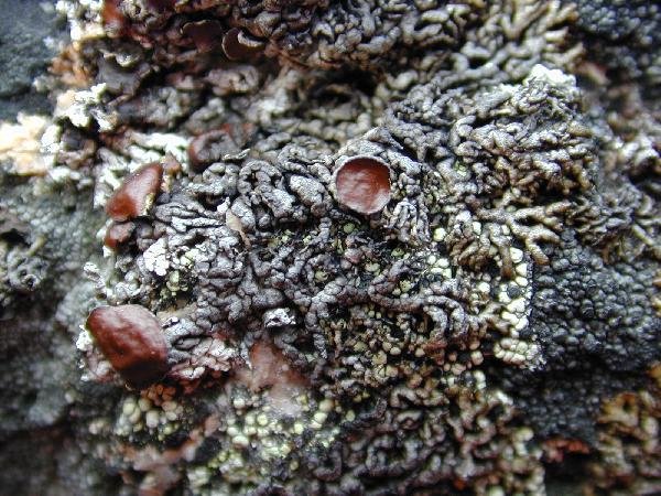 Description: Thallus foliose, heteromerous, dorvisentral, adnate, forming 2-5 cm wide, orbicular or irregular rosettes. Lobes up to c. 2.5 cm long, 0.5-1(-2) mm broad, more or less convex, stiff, contiguous or overlapping; center of thallus with narrower (0.2-0.4 mm), flattened secondary lobules which arise perpendicularly to the surface. Upper surface pale grey to brownish, darkening or blackening especially on the lobules and towards the tips, and there becoming glossy, reticulate-maculate at least in the apical 2-3 mm. Lower surface black, brown toward the tips, smooth to weakly and shallowly wrinkled, erhizinate, with scattered hapters. Upper cortex paraplectenchymatous, the cell walls with Cetraria-type lichenan, with a non-pored epicortex; medulla white, solid; lower cortex paraplectenchymatous, without an epicortex. Apothecia rare, lecanorine, up to 5(-7) mm across, with a dark brown disc and a thin, entire to sublobulate thalline margin. Epithecium brownish; hypothecium and hymenium colourless. Asci 8-spored, clavate, the K/I+ blue tholus penetrated by a faintly amyloid apical cushion with parallel or diverging flanks, the wall K/I-, surrounded by a K/I+ blue outer layer, Lecanora-type. Ascospores 1-celled, hyaline, subglobose to broadly ellipsoid, 10-12 x 6-8 µm. Pycnidia numerous, immersed, the visible part black to grey-brown. Conidia bifusiform, 5-7 x c. 1 µm. Photobiont chlorococcoid. Spot tests: upper cortex K+ yellow, C-, KC-, P-; medulla K+ slowly reddish to orange-brown, C-, KC-, P+ orange, UV-. Chemistry: upper cortex with atranorin and chloroatranorin; medulla with fumarprotocetraric acid.Note: an arctic-alpine to boreal-montane, circumpolar lichen found in more sheltered and less wind-exposed situations than B. atrofusca, on faces of acid siliceous rocks with a long snow-cover, with optimum above treeline; most frequent in the Alps, but also present in the high Mediterranean mountains.