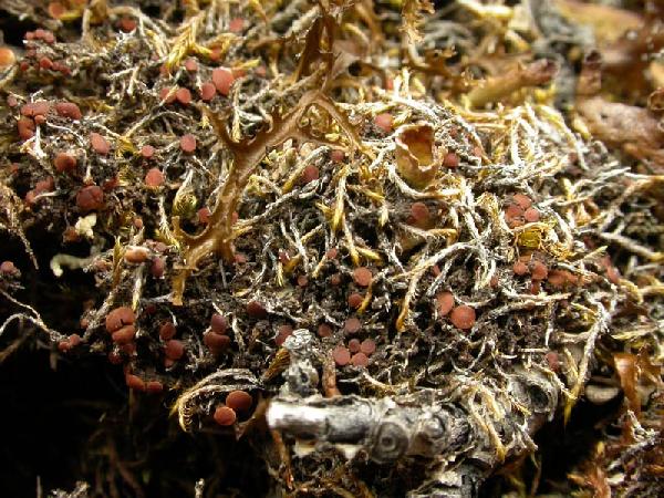 Description: Thallus crustose, episubstratic, subgelatinous when wet, granulose, the granules sometimes aggregated and/or elongate, up to 0.3 mm in diam., grey-brown to dark brown. Cortex 8-16 µm thick, usually of a single layer of cells; internal hyphae forming a reticulate pattern around the clusters of photobiont cells. Apothecia common, biatorine, (0.3-)0.5-1(-2.5) mm across, with a convex, orange-brown disc and a paler, smooth, often finally excluded proper margin. Proper exciple 95-145(-215) µm thick; epithecium brownish; hymenium colourless, hemiamyloid, 110-120(-140) µm high; hypothecium colourless. Asci 8-spored, with internal amyloid ring-shaped structures. Ascospores 1-celled, hyaline, ellipsoid, 15-25 x 6-12 µm, with a slightly warted exospore. Pycnidia rare, wart-like, brown-black, the conidiophores short-celled. Conidia pleurogenous, bacilliform, 4-5 x c. 1 µm. Photobiont cyanobacterial (Nostoc, the cells in clusters). Spot tests: thallus K-, C-, KC-, P-, UV-. Chemistry: without lichen substances. Note: an arctic-alpine species growing on slightly calcareous soil and plant debris in snow-bed communities, most frequent in the Arctic zone but also found in the Alps (Switzerland, see Jørgensen 2000), where it may have been overlooked. To be looked for in the Italian Alps.