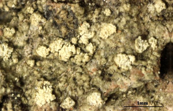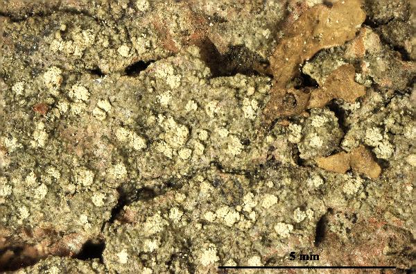 Description: Thallus crustose, thinly episubstratic, grey, matt or more often shiny, continuous, slightly folded or rimose, more rarely rimose-areolate, the areoles flat to rarely slightly convex and not constricted at base. Soralia whitish to greenish-grey, flat or more often convex, rounded to irregular, mostly discrete, bursting from flat parts of thallus or from areoles, sometimes crowded and coalescing, but the boundaries between them often visible, very rarely fused into irregular patches in older parts of thallus. Soredia up to 50 μm in diam., often gathered into up to 100 μm wide consoredia. Apothecia very rare, lecanorine, single, up to 1.2 mm across, with a reddish brown, faintly white-pruinose, flat to finally convex disc and a thin, often sorediate thalline margin. Proper exciple poorly evident; epithecium yellowish brown, K+ pale reddish brown, with dense granules dissolving in K; hymenium colourless, up to 100 μm high, I+ blue; paraphyses mostly simple, rather lax, not or only slightly swollen at tips; hypothecium colourless to pale brown. Asci 8-spored, with a uniformly amyloid apical dome. Ascospores (0-)3(-5)-septate, coiled in the asci, hyaline, fusiform, curved, 35-48 x 5-7 μm. Photobiont chlorococcoid, the cells up to 12 μm wide. Spot tests: thallus and soralia K+ rapidly bright lemon yellow, C-, KC- or KC+ yellow, P+ yellow-orange, UV-. Chemistry: thamnolic acid (major), elatinic acid (minor, trace or absent) and squamatic acid (trace or absent).