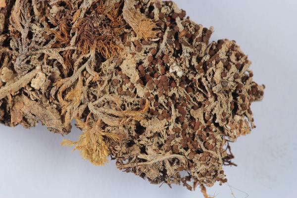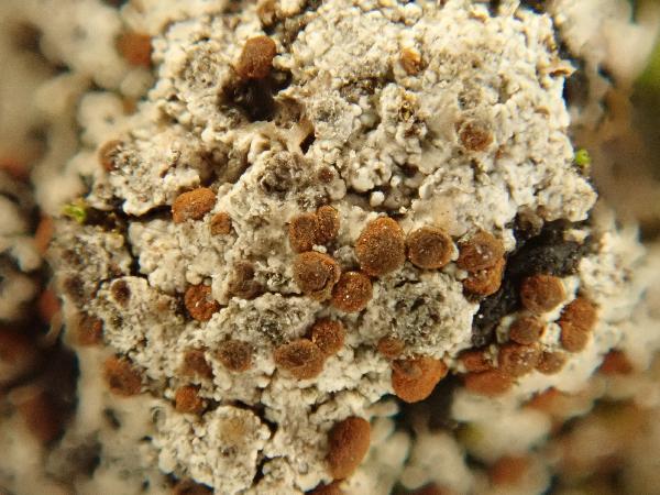 Description: Thallus crustose, episubstratic, whitish to grey, thin to rather thick, areolate, the areoles flat to convex, contiguous, sometimes almost subsquamulose, 0.1-0.3 mm broad, smooth, epruinose, forming a compact crust. Upper cortex paraplectenchymatous; medulla poorly developed, dense. Apothecia frequent, biatorine, sessile, constricted at base, 0.2-0.6(-0.9) mm across, with a rusty red to dark reddish brown or finally blackish brown, at first flat, but rapidly strongly convex, rough disc; thalline margin indistinct in mature apothecia; proper margin thin, evident only in very young apothecia. Proper exciple up to 80-100 μm wide, the inner part broad, paraplectenchymatous, colourless; epithecium coarsely granular, orange, K+ purple-red, C+ purple; hymenium colourless, 100-120 μm high; paraphyses not gelatinized, branched in upper part, the terminal cells sometimes swollen, 2-6 μm wide; hypothecium colourless to pale brown. Asci mainly 8-spored, clavate, functionally unitunicate, apically thickened with a broad internal beak, the inner part of apex and external cap I+ blue, Teloschistes-type. Ascospores 2-celled, polarilocular, hyaline, broadly ellipsoid, (12-)15-20(-23) x (6-)8-10(-12) µm, the equatorial thickening (“septum”) 2.5-3(-4) µm (1/4-1/3 of spore length). Photobiont chlorococcoid. Spot tests: thallus K- or K+ yellow, C-, KC-, P-; apothecia K+ purple-red, C+ purple. Chemistry: thallus without lichen substances or with low amounts of atranorin; apothecia with chlorinated anthraquinones (citreorosein, emodinal, emodinic acid, emodin).Note: a holarctic lichen ranging from the arctic zone to the high southern mountains, found on mosses and plant debris on calcareous or base-rich siliceous substrata, with optimum near or above treeline, sometimes reaching the montane belt in open habitats; common in the Alps, restricted to the highest areas of the Apennines.