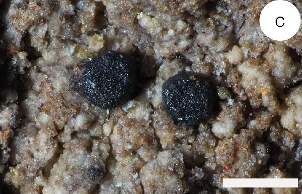 A, holotype of T. dissimilis (M-0290432, JG149); thallus, consisting of scattered ±rounded or flattened or subsquamulose granules, and dark apothecia with light brown margin - Scale: 0.5 mm