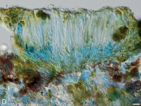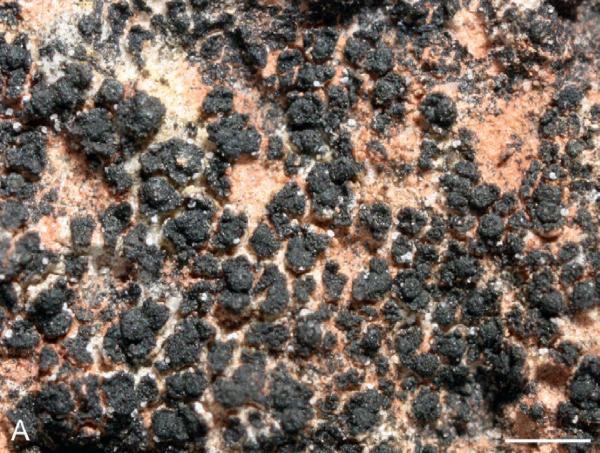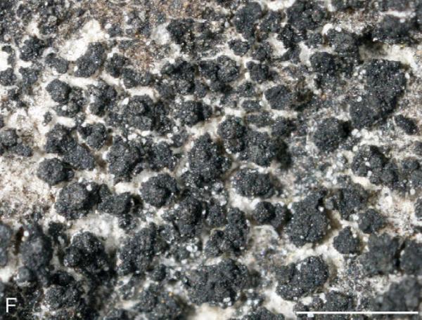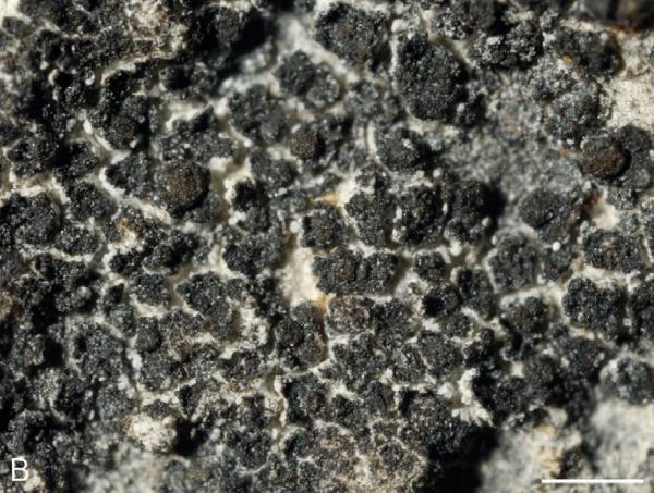 Description: Thallus crustose-areolate, blackish, granulose or consisting of areoles, these poorly delimited, (0.1.)0.2-0.3 mm wide, thin or swollen when fertile, attached by rhizohyphae, forming up to 2 cm wide patches. Upper cortex absent, the thallus homoiomerous, more or less paraplectenchymatous, the hyphae forming an irregular network around the cyanobionts. Apothecia thallinocarps, developing from free ascogones, up to 0.25 mm across, more or less hidden in the thallus, with an initially convex, then flattened, black disc and a flat and indistinct thalline margin. Proper exciple absent; hymenium colourless, 60–65 µm high, covered by sparse patches of sterile thalline plectenchyma with sparse photobionts, K/I+ yellowish-red slowly turning blue; paraphyses scarce, septate, becoming branched and anastomosing. Asci 8-spored, prototunicate, with an amyloid outer cap, Peccania-type. Ascospores 1-celled, hyaline, small, broadly ellipsoid to subglobose, 5-8.5 x 5-6.7 μm. Photobiont cyanobacterial, chroococcoid, with yellowish brown gelatinous sheaths. Spot tests: all negative. Chemistry: without lichen substances.Note: an apparently very rare, but perhaps overlooked species growing on intermediate rocks, such as calciferous sandstone, calciferous shosts or siliceous limestone (Kieselkalk) in sites with periodical water seepage. Described from Germany and also known from the Alps (France, Switzerland); to be looked for in Italy.