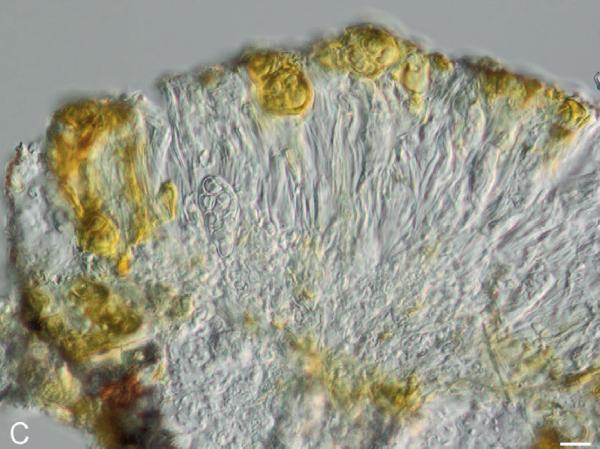 Areoles with small, gall like thallinocarps (Prieto SL28). Scale bar: 1 mm