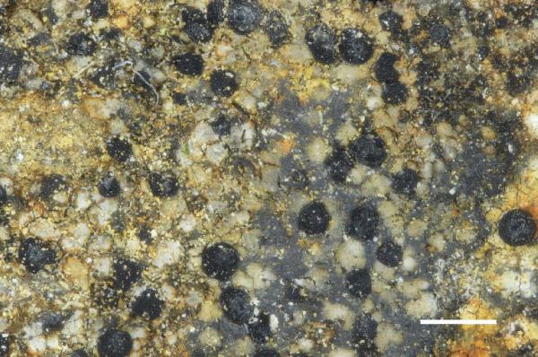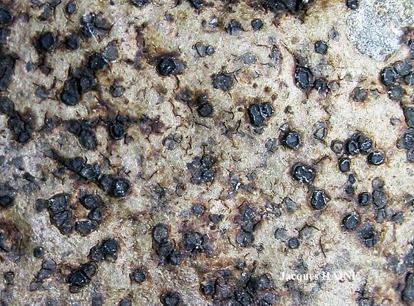 Description: Thallus crustose, episubstratic, pale grey to grey-brown, rimose to areolate, the areoles flat, 0.3-0.4 mm wide, forming small, usually less than 2 cm wide patches. Medulla white, I-. Apothecia, lecideine, black, developing among the areoles, 0.3-0.4(-0.5) mm across, with a flat to slightly convex disc and a more or less distinct, finally sometimes excluded proper margin. Proper exciple dark throughout, of radiating, dark brown hyphae; epithecium green to blue-black, K-, N+ red; hymenium colourless, I+ blue; paraphysoids branched and anastomosing, coherent in water but easily made free in K, 2.5-3 µm thick at mid-level, the apical cells abruptly swollen, to 3 µm wide, with a sharply delimited dark cap; hypothecium dark brown. Asci 8-spored, clavate, fissitunicate, with a well-developed tholus, lacking an ocular chamber, Rhizocarpon-type. Ascospores 1-septate, hyaline, 15-18 x 7-8.5 µm, halonate. Photobiont chlorococcoid. Spot tests: medulla K+ yellow or K-, C-, KC-, P+ orange or P-. Chemistry: medulla with stictic acid, or without lichen substances.Note: a silicicolous species of rather exposed sites, most frequent in Western Europe, with a single record from the Western Alps (Switzerland). To be looked for in the Italian Alps.