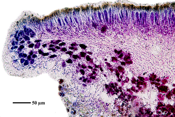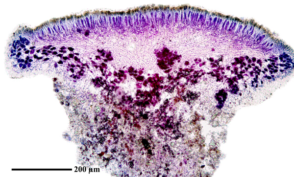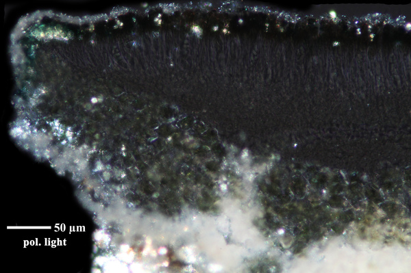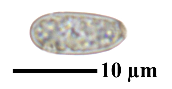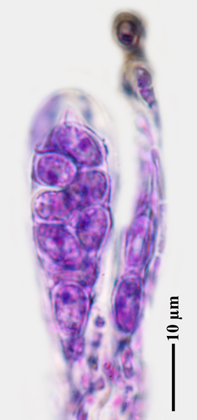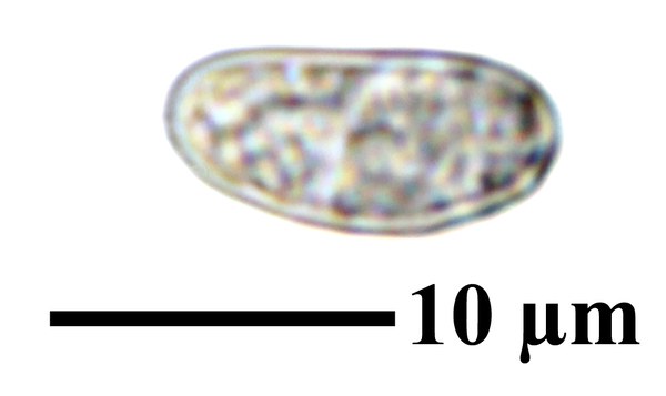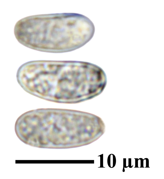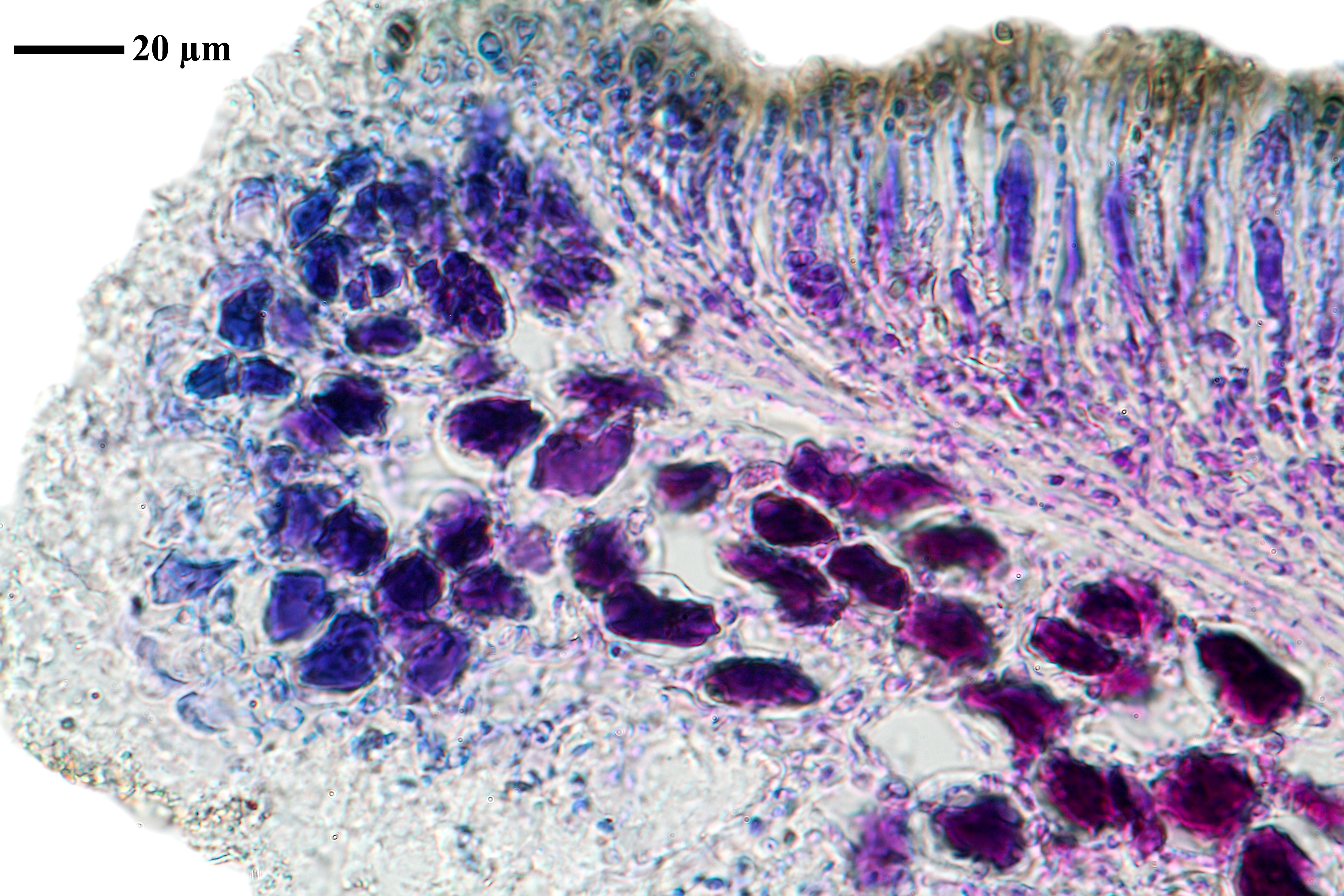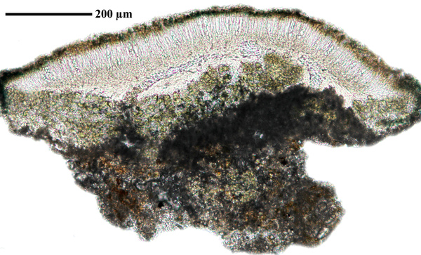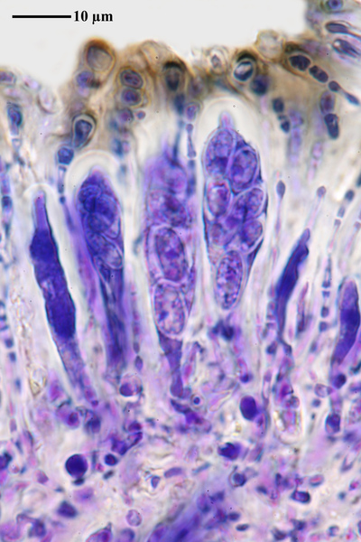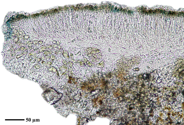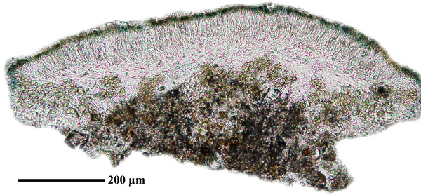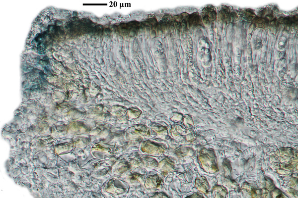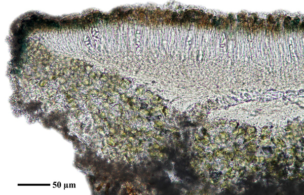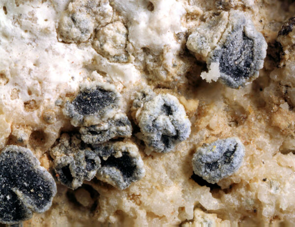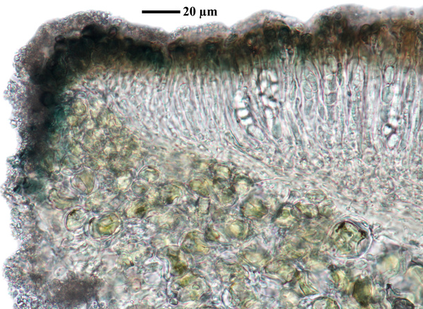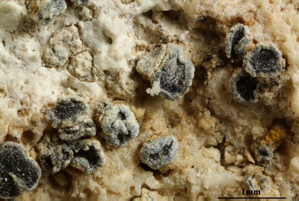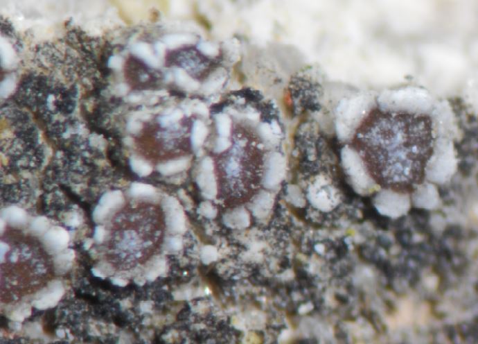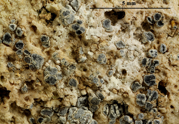 Description: Thallus crustose, endosubstratic or rarely very thinly episubstratic and mostly continuous to rimose, whitish to pale grey. Apothecia lecanorine, scattered or clustered in mall groups, sessile or slightly immersed in the rock at base, 0.3-0.9 mm across, with a flat, smooth, dark brown to black, usually epruinose (rarely faintly pruinose) disc and a prominent, markedly cracked, epruinose thalline margin. Thalline exciple 80-120(-200) μm thick, corticate, bluish in upper part, the cortex indistinctly delimited, 30-35 μm thick laterally, often obscured by crystals visible under polarized light, which are insoluble in K and soluble in N; proper exciple indistinct or up to 10 μm wide; epithecium brown to olive, or partly bluish-green or greenish, the green parts K+ intensifying, N+ red, without granules and without a well-developed epipsamma; hymenium pigmented in upper part for up to 1/3 of its height, colourless in lower part, 30-50 μm high; paraphyses thick and coherent, often branched at tips, the uppermost part submoniliform and pigmented, the terminal cell up to 6 μm wide; subhymenium distinct, granular; hypothecium colourless, 45-70 μm high, of adglutinated hyphae, with oil droplets.. Asci 8-spored, elongate-clavate, very thin-walled, with a K/I+ blue, tall tholus penetrated by a faintly amyloid apical cushion, the wall K/I-, surrounded by a K/I+ blue outer layer, Lecanora-type. Ascospores 1-celled, hyaline, narrowly ellipsoid, 12-18 x 4-6 μm, 2.3-3.7 times as long as wide. Pycnidia black, inconspicuous. Conidia sickle-shaped, curved, 16-19 x c. 1 μm. Photobiont chlorococcoid. Spot tests: thallus and apothecia K-, C-, KC-, P-, UV-. Chemistry: without lichen substances.Note: a mainly calcicolous species, sometimes also found on base-rich volcanic rocks, described from China and later found in Southeast Asia and North America, also reported from the Alps (France, see Roux & Coll. 2025) where it is probably more widespread due to confusion with P. caesioalba. To be looked for in the Italian Alps.