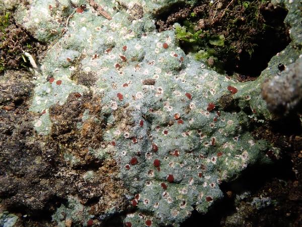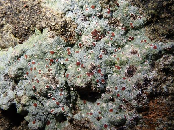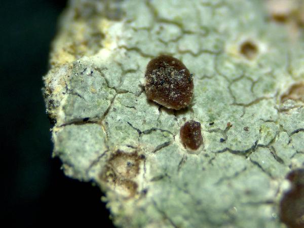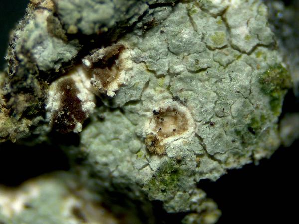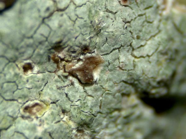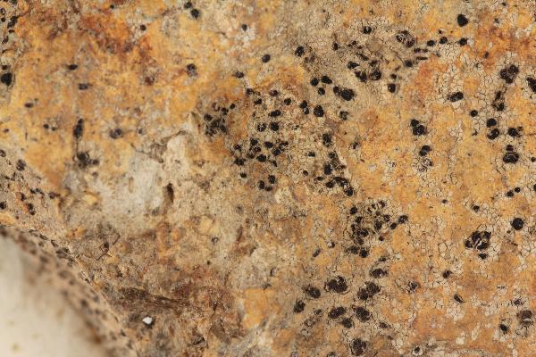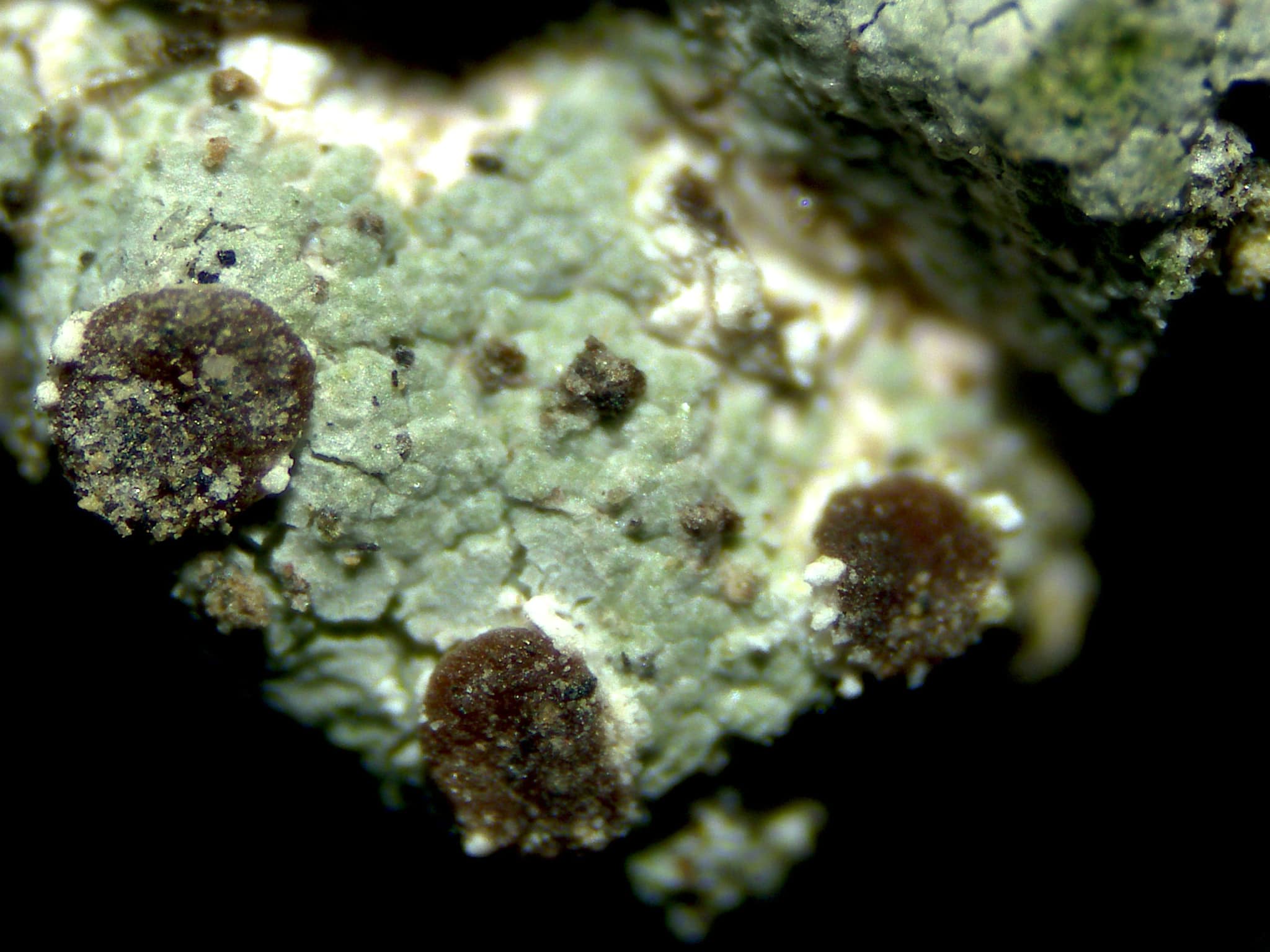 Description: Thallus crustose, episubstratic, initially continuous, then rimose, pale grey or pale pinkish grey, rarely with a faintly brownish hue, thinning to the margin, the margin at most with slightly convex and indistinct areoles, soon coalescing to form an entire or cracked crust, which may be discontinuous in less favourable habitats. Apothecia up to 0.6 mm across, often at first visible as a pale pruinose disc, with a pinkish-grey to pale or dark reddish-brown, flat to slightly convex disc and a usually white, slightly roughened or pruinose, sometimes irregularly crenulate, often finally excluded margin, some of them sometimes surrounded by a more or less circular fissure with a white-pruinose surface. Proper exciple of colourless hyphae embedded in a colourless to weakly pigmented gel; epithecium almost colourless to pale yellowish brown; hymenium colourless, 90-140 µm high; paraphyses coherent, thin, densely branched and anastomosing, not thickened at apex; hypothecium colourless to yellowish. Asci 8-spored, cylindrical-clavate, unitunicate, thin-walled, the apical dome K/I-, or weakly K/I+ blue, Trapelia-type. Ascospores 1-celled, hyaline, ellipsoid, 14-24.5 x 8-12.5 μm. Photobiont chlorococcoid. Spot tests: thallus K-, C+ red, KC+ red, P-, UV+ bluish white. Chemistry: thallus with gyrophoric acid (major) and 5-O-methylhiascic acid (trace)Note: a cryptic species, hardly distinguishable from T. coarctata without molecular analysis, growing on base-rich siliceous rocks, mostly below the montane belt. For further details see Orange (2018) and Orange & al. (2021).