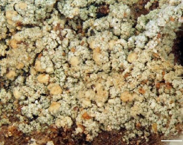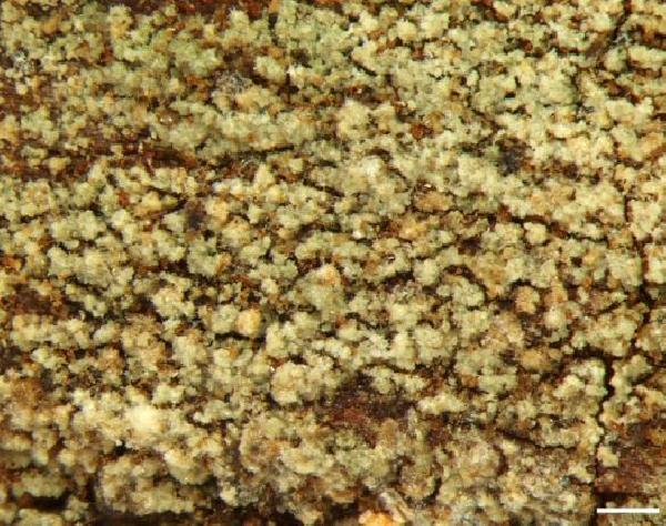Description: Thallus crustose, episubstratic, green to grey-white, up to 0.2-0.3 mm thick, ecorticate and non-stratified, wide-spreading, continuously granular to granular-areolate or becoming farinose, the surface often more or less continuously covered by a white to greyish white hyphomycetous anamorph, more aggregated on convex granules/areoles and then resembling sporodochia. Apothecia 0.05-0.25 mm across, dispersed or locally abundant, sometimes aggregated or tuberculate and then to 0.4 mm across, whitish to pale ochre-yellow, more or less glossy, with a flat to slightly convex disc, emarginate. Proper exciple poorly developed and receding, indistinctly delimited, of c. 1.5 µm thick, radiating hyphae, sometimes with shortly protruding free ends; apothecial sections usually inspersed with c. 2 µm wide oily granules partly dissolving in K; hymenium colourless, 15-20(-25) µm high; paraphyses mostly branched, 1-1.2 µm thick, the apical cells hardly wider, or some paraphyses with 2-2.5 µm wide, capitate apical cells; hypothecium colourless, paraplectenchymatous but usually hardly discernable due to the inspersion of oily granules. Asci 8-spored, clavate, sometimes with a stalked narrow basal part, the apex poorly developed, an apical apparatus of the -type only rarely observed in young asci after K/I application, 12-18 x 4.5-5 µm. Ascospores 1-celled, hyaline, elongate-ellipsoid to tear-shaped, 4-6 x 1.5-1.8 µm. Conidiogenous hyphae superficial, erect, hyaline, the conidiogenous phialidic cells cylindrical, slightly widening at base, 10-18(-20) µm high and up to 2-2.5 µm wide at base. Conidia ellipsoid, pointed at one end, (2.5-)3-3.5(-4) x 1-1.2 µm, formed singly or in chains. Photobiont Stichococcus-like, of slightly elongated cells. Spot tests: thallus K-, C-, KC-, P-, UV+ ice-blue. Chemistry: 2-3 (or more) unidentified UV+ ice-blue substances. Note: this recently-described species has so far been recorded from a few localities in southern Bohemia, growing on rain-sheltered, decaying, soft coniferous wood of stumps in humid forests, where it inhabits rain-sheltered and quite shaded microniches. For further details see Palice & al. (2023). To be looked for in Italy, especially in the Alps.