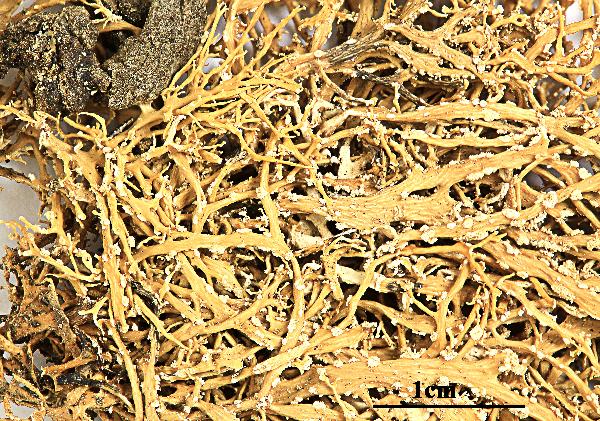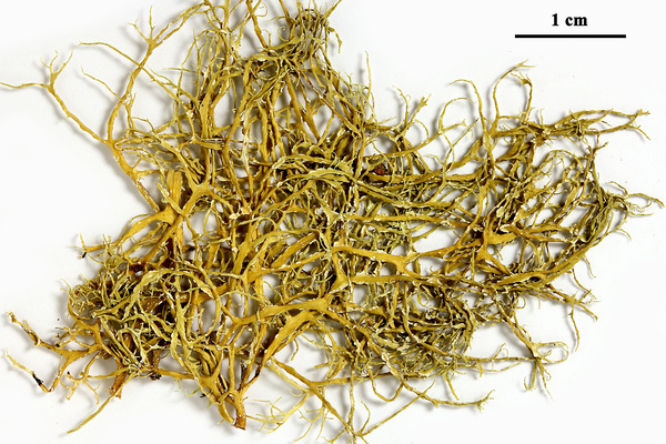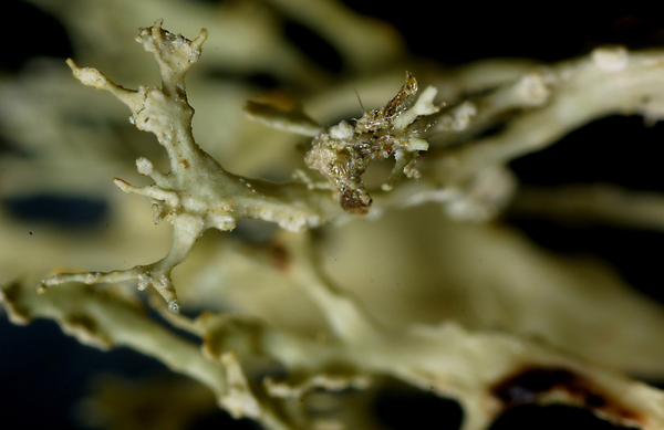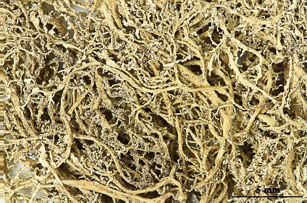 Description: Thallus fruticose, greenish, shrubby or tufted, up to 5 cm long (usually less), densely and intricately branched, the branches often twisted, solid, with ellipsoid to linear pseudocyphellae and often with dense, fragile lateral branchlets, slightly flattened but not clearly dorsiventral, 0.1-0.9(-1.5) mm wide, with conspicuous, well-delimited, marginal soralia bearing granulose soredia and often also small fibrils. Cortex 2-layered, the outer part paraplectenchymatous, the inner part cartilaginous; medulla compact. Apothecia very rare (unknown in Mediterranean samples), lecanorine, 0.5-2 mm across, with a concave, greenish to pale brown disc and an often crenulate, thin thalline margin. Epithecium pale brownish-olive; hymenium and hypothecium colourless; paraphyses thick-walled, richly branched in upper part. Asci 8-spored, the apical dome K/I+ dark blue with a pale, conical-pointed apical cushion (axial mass), the wall I-, but the thin outer gel I+ blue, Bacidia-type. Ascospores 1-septate, hyaline, narrowly fusiform, straight or slightly curved, 14-18(-20) x 3-4.5 μm. Photobiont chlorococcoid. Spot tests: K-, C-, KC- or KC+ pale yellow (cortex only), P-. Chemistry: cortex with usnic acid; medulla with homosekikaic and sekikaic acids.Note: a widespread, mainly tropical-subtropical species also reported (as R. crispans) from Morocco and Greece, mostly growing on twigs in open vegetation. For further information see Spjut & al. (2020) and Sipman & Ramírez Ordaya (2023) . To be looked for in Mediterranean Italy.