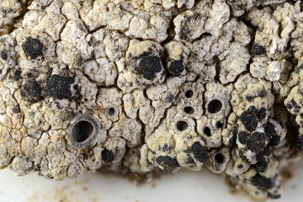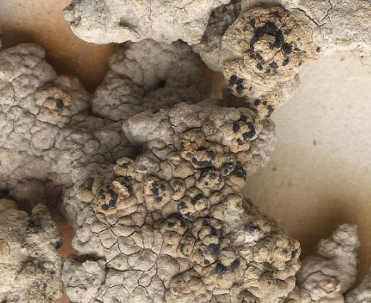 Description: Thallus doubtfully lichenized, inducing the formation of (0.4-)0.7-1.5(-4) mm wide, convex, whitish, ochraceous or greenish, finely fissured, often pruinose gall-like structures on the thalli of terricolous Diploschistes species. Apothecia black, sessile, orbicular to irregular in outline, flat to strongly convex, (0.2-)0.3-0.7(-0.8) mm across, soon becoming emarginate. Proper exciple poorly developed, dark; epithecium thick, opaque, dark brown to olivaceous black, K+ purple-red; hymenium colourless, 60-90 µm high, I+ blue; paraphysoids coherent, branched and anastomosing, c. 2.5 µm thick at mid-level, the apical cells capitate, 4-5 µm wide; hypothecium brown-black to reddish brown, 75-112 µm high, K-. Asci 8-spored, clavate, fissitunicate, with a well-developed tholus that is K/I- in lower part and K/I+ blue near the apex, lacking an ocular chamber, Rhizocarpon-type. Ascospores (1-)3-spetate, rarely finally weakly submuriform, slightly constricted at septa, brown, narrowly ellipsoid, 15-23 x 5-10 µm, halonate at least when young. Photobiont probably absent. Spot tests: those of the hosts. Chemistry: thallus probably without lichen substances.Note: a probably non-lichenized species inducing the formation of gall-like structures on the thalli of terricolous, often gypsicolous species of Diploschistes, described from Spain and known from Southern France (incl. Corsica) and the southern Balkan Peninsula, with outposts in the dry valleys of Norway. To be looked for in Italy.