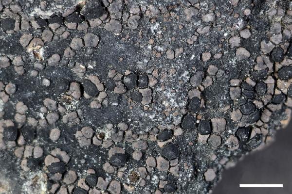 Description: Thallus crustose, episubstratic, grey to grey-brown, areolate, forming up to 10 cm wide patches delimited by a black prothallus, the areoles more or less contiguous, orbicular or angular to slightly crenulate, flat to usually convex. Medulla I-, K/I-. Apothecia black, epruinose, up to 1 mm across, orbicular, with a more or less flat disc and a thin proper margin. Proper exciple blackish brown, K+ purple-red or K-; epithecium dark brown, thin, sharply delimited, without crystals and granules, K+ rather faintly purple-red; hymenium colourless; paraphysoids branched and anastomosing; hypothecium brown, K-. Asci 8-spored, clavate, fissitunicate, with a well-developed tholus that is K/I- in lower part and K/I+ blue near the apex, lacking an ocular chamber, Rhizocarpon-type. Ascospores 1-septate, soon dark brown, ellipsoid, 26-35 x 12-17 µm. Photobiont chlorococcoid. Spot tests: cortex and medulla K-, C-, KC- P-. Chemistry: medulla with diffractaic acid.Note: a recently-described species resembling Rh. badioatrum but differing in often forming more rounded, convex, and greyish areolae; in having a more narrow and more sharply delimited epithecium with a less intense K+ red reaction, and especially in containing diffractaic acid. The species seems to be widespread in Scandinavia, with several records in Central and Southern Europe, e.g. in Slovakia (Timdal & al. 2024) and France, including Corsica (Roux & Coll. 2025). It should be looked for also in Italy (specimens of Rh. badioatrum should be chemically analysed).