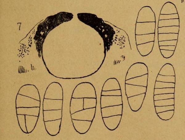 Description: Thallus crustose, thinly episubstratic, grey-brown, rimose or rimose-areolate near the perithecia, the areoles – when present - up to 0.4 mm wide, smooth, acutely angular, separated by thin fissures. Cortex up to 12 μm thick, brown and paraplectenchymatous in upper part, the cells c. 4 x 2 μm; algal layer c. 50 μm thick, inspersed with rock granules; medulla poorly developed, colourless or patchily brownish in lower part. Perithecia black, 0.3-0.4 mm across, semi immersed in 0.4-0.6 mm wide, convex thalline warts, projecting with the up to 0.2 mm wide, at first concave, then flattened upper part. Involucrellum carbonaceous, up to 60 μm thick, dimidiate, appressed to exciple; exciple up to 0.3 mm across, up to 25 μm thick in lower part, colourless except in the periostiolar area; hamathecium of 25 μm long periphysoids, interascal filaments absent; hymenial gel hemiamyloid, I+ red (I+ blue at very low concentrations of I), K/I+ blue. Asci 8-spored, clavate, K/I–, fissitunicate, the wall thickened above, with an ocular chamber, dehiscent by extrusion of an endotunica to form a delicate rostrum, 90-35 x 27-35 μm. Ascospores 3-7 transversally septate, rarely weakly submuriform with a single longitudinal septum., hyaline, oblong-ellipsoid to oblong-ovoid, 35-50 x 16-20 μm. Photobiont chlorococcoid. Spot tests: K-, C-, KC-, P-, UV-. Chemistry: without lichen substances.Note: a species which deserves further study, known only from the type collection from Saltino near Vallombrosa, at c. 1000 m, on siliceous rocks.