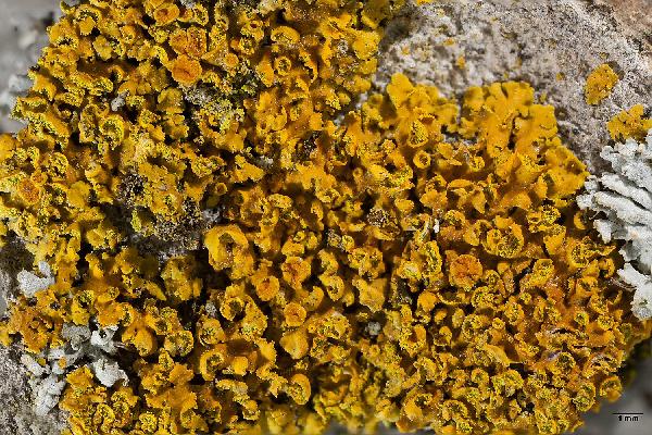 Description: Thallus foliose, heteromerous, dorsiventral, orange to orange-yellow, adnate to loosely adnate, lobed, forming regular to irregular, 1-2.5 cm wide rosettes which often coalesce to cover much larger surfaces. Lobes flattened, 2.5-5(-7) mm long, the marginal ones (0.7-)2-3(-4) mm wide, smooth, at first with helmet-shaped soralia at the apex of short, inner, appressed lobes, formed between the upper and lower cortices, soon becoming crescent-shaped to almost crater-like, the soredia yellow, contrasting with the orange thallus colour. Lower surface white to yellow, somewhat wrinkled, with many short, white rhizines. Upper and lower cortex paraplectenchymatous; medulla white. Apothecia lecanorine, very rare, 0.5-0.7 mm across, laminal, stipitate, the margin initially smooth but often becoming sorediate. Thalline exciple paraplectenchymatous; proper exciple a strongly gelatinized plectenchyma with unoriented, short-celled hyphae; epithecium orange-brown, K+ purple-red; hymenium colourless; paraphyses simple or sparingly branched; hypothecium colourless. Asci 8-spored, clavate, functionally unitunicate, apically thickened with a broad internal beak, the inner part of apex and external cap I+ blue, Teloschistes-type. Ascospores 2-celled, polarilocular, hyaline, ellipsoid, (10.5-)12-16 x 5-6 µm, the equatorial thickening (“septum”) 3-5(-6) µm. Pycnidia common, immersed to projecting, darker orange than thallus. Conidia short-bacilliform, 3.5-4.2 x 0.9-1 µm. Spot tests: thallus and soredia K+ purple-red, C-, KC-, P-, UV+ orange. Chemistry: parietin (major), fallacinal (major), emodin, teloschistin (major) and parietinic acid (chemosyndrome A3 of Søchting 1997).Note: a recently-described epiphytic species differing from X. fallax in the much larger lobes with numerous rhizines, in the narrower spores with shorter septum, and in the ecology (epiphytic versus mainly saxicolous). From a preliminary analysis of the epiphytic samples filed under X. fallax in TSB, most of them appear to belong to X. huculica. Thus, I have placed here all records of epiphytic X. fallax from Italy. The species seems to be most frequent in areas with a subcontinental climate (dry alpine valleys and eastern side of the Peninsula). Earlier records from Southern Italy (see Nimis 1995, 2016) may be due to confusion with X. fulva, and are not accepted here.