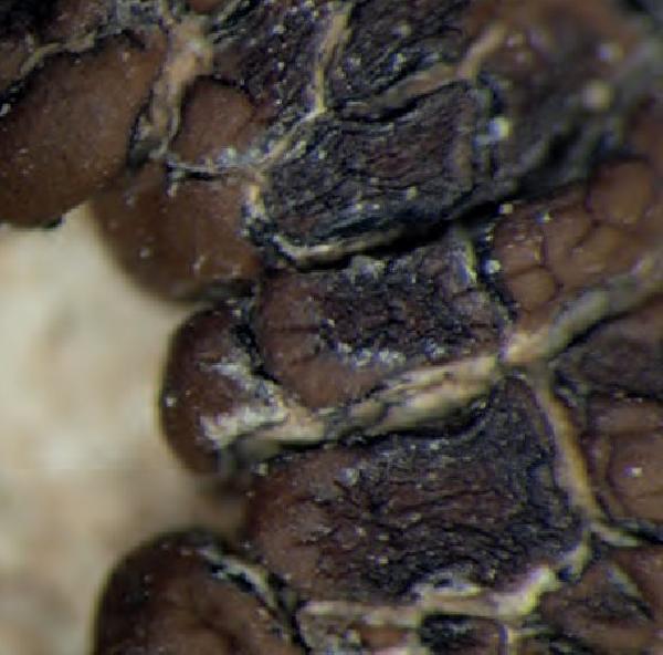 Description: Thallus crustose-placodioid, episubstratic, chestnut brown, glossy, smooth or rugose, epruinose, areolate in central parts, the marginal lobes convex, radiating, up to 2 mm long, 0.4-1.5 mm wide. Cortex dark brown in upper part, colourless in lower part; algal layer more or less continuous; medulla white. Apothecia lecanorine, angular, immersed, with a sulcate, brown-black disc and a thin thalline margin. Proper exciple indistinct or thin; epithecium brown; hymenium colourless, 90-150 µm high; paraphyses stout, 2-3 µm thick base; hypothecium colourless. Asci 100-200-spored, clavate, the apical dome K/I-. Ascospores 1-celled, hyaline, broadly ellipsoid to subglobose, 3-4.5(-5.5) x 2-3.5 µm. Photobiont chlorococcoid. Spot tests: cortex and medulla K-, C-, KC-, P-, UV-. Chemistry: without lichen substances.Note: among the species with a brown effigurate thallus, this is the only one with subglobose ascospores; described from high altitudes in the Sierra Nevada (Spain), with a few records from the Western Alps (France) and from the mountains of Morocco, growing on non- or slightly calciferous siliceous rocks in dry, sunny, moderately eutrophicated situations. To be looked for in Italy.