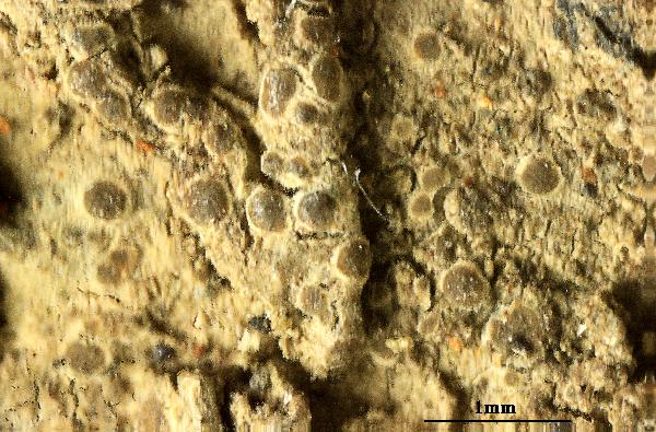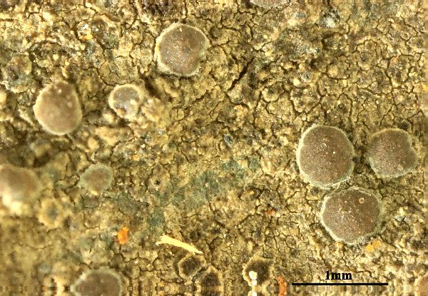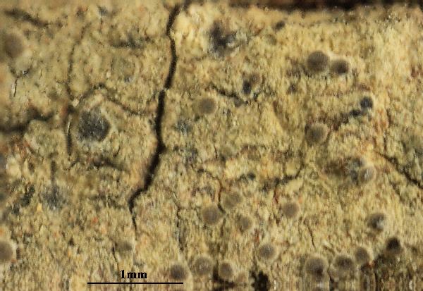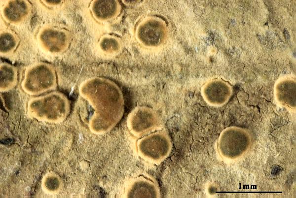 Description: Thallus crustose, thinly episubstratic, greenish grey to greenish brown, continuous to rimose, minutely granulose or farinose, forming orbicular, often confluent patches 1-3 cm in diam., often delimited by dark prothallus. Apothecia scattered to clustered, round to irregular in outline by mutual compression, 0.3-0.6 mm across, with a flat to slightly convex, orange-brown, grey-brown or finally dark brown disc surrounded by a cottony-arachnoid, tomentose, yellowish white to yellowish grey rim devoid of crystals. Proper exciple formed by loosely intricate hyphae, not inspersed with crystals; epithecium colourless to pale brown, without crystals; hymenium colourless, I+ blue; paraphyses simple or sparingly branched, the apical cells not swollen; hypothecium dark red-brown, K+ purple. Asci 8-spored, clavate, with a K/I+ blue apical dome containing a darker blue, tubular ring-structure, and an amyloid coat, Byssoloma-type. Ascospores 3-septate, hyaline, fusiform, 10-18 x 2-4 µm. Pycnidia grey-black, sessile, globose. Conidia pyriform. Photobiont chlorococcoid. Spot tests: thallus K-, C-, KC-, P- or P+ orange red. Chemistry: without lichen substances, or with argopsin.Note: a pantropical foliicolous species occurring also on bark. It is included in the Italian red list of epiphytic lichens as “Vulnerable” (Nascimbene & al. 2013c).