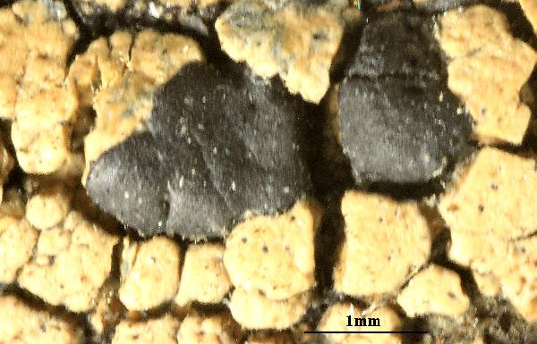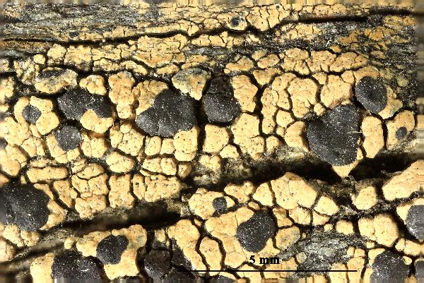 Description: Thallus crustose, episubstratic, rather thick, warted-areolate, pale greenish yellow to yellowish brown, usually turning brown in the herbarium, forming up to 8(-10) cm wide patches, rarely delimited by a black prothallus. Areoles mostly contiguous, up to 2 mm wide, flat to convex. Cortex up to 60 µm thick, of thick-walled hyphae with cylindrical lumina, containing crystals dissolving in K; medulla white, of loosely interwoven, thin-walled hyphae, I-. Apothecia biatorine, black to brown-black, somehow shiny, 0.5-2(-3) mm across, with a flat to finally irregularly convex, epruinose disc, and a thin, poorly evident, soon excluded proper margin. Proper exciple poorly developed, with a dark brown to dark green-brown rim, paler brown within; epithecium bluish green-black, sometimes in part brown; hymenium colourless, 60-80 µm high, I+ blue; paraphyses coherent, sparingly branched and anastomosing, 3-4 µm thick in lower part, the apical cells to 8 µm wide, with a sharply delimited pigmented zone in the wall, covered by a green gel; hypothecium colourless in upper part, pale yellow-brown in lower part, I-. Asci 8-spored, clavate, the K/I+ blue tholus penetrated by a faintly amyloid apical cushion with parallel or diverging flanks, the wall K/I-, surrounded by a K/I+ blue outer layer, Lecanora-type. Ascospores 1-celled, hyaline, ellipsoid, (7.5-)9-13.5(-16) x (4.5-)5-7.5(-8.5) µm. Pycnidia dark, immersed, the wall greenish around the ostiole. Conidia hyaline, short-bacilliform, straight, 6-9 x 1-2 µm. Photobiont chlorococcoid. Spot tests: cortex K+ yellow, C-, KC+ yellow, P-; medulla K+ yellow-orange, C+ yellow, KC-, P+ orange or rarely P-. Chemistry: Chemotype I: atranorin, usnic and bourgeanic acids (the most common in the Alps). Chemotype II: atranorin, usnic, bourgeanic, and stictic acids, Chemotype III: atranorin and bourgeanic acid, chemotype IV: atranorin only.Note: an arctic-alpine, circumpolar species found on inclined faces of hard siliceous rocks in upland areas.