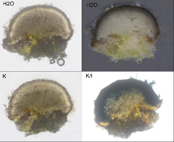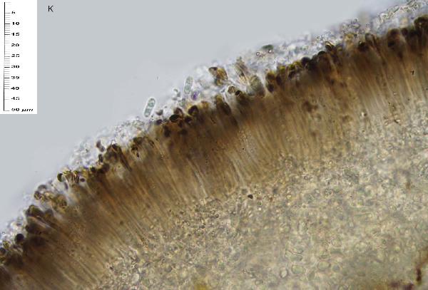 Description: Thallus crustose, endosubstratic or thinly episubstratic, 0.1-0.3 mm thick, continuous to rimose or granular, rarely areolate, white to pale brown. Phenocortex, 7-25(-40) µm thick, the terminal cells usually brown-capped, sometimes absent and substituted by a thin epinecral layer. Apothecia lecideine, at first often slightly immersed, then broadly sessile and constricted at base, (0.15-)0.2-0.6(-0.8) mm across, with a reddish brown to dark brown, rarely black (much paler when wet), at first flat but soon convex, usually epruinose disc, and a thin, slightly raised, entire, often finally excluded proper margin. Proper exciple pale to dark brown and K+ purple at outer edge, pale brown to colourless in inner part, of conglutinated hyphae, the outer ones with dark caps; epithecium dark brown to almost black, 6-15 μm high, K-, N-; hymenium colourless, (30-)40-60(-70) µm high, I+ blue, then wine-red; paraphyses simple, easily made free, 1.5-2 μm thick at mid-level, the apical cells capitate, with a dark brown pigment located within the cell walls; hypothecium more or less colourless, 50-130 μm high. Asci 8-spored, cylindrical-clavate, with a K/I+ blue outer coat and a K/I+ uniformly blue apical dome, Catillaria-type. Ascospores 1-septate, hyaline, oblong or oblong-ellipsoid, 7-10(-12) x (2-)2.5-3.5(-4) µm. Pycnidia globose-ovoid, the wall brown (cells with dark caps). Conidia ellipsoid to short-cylindrical, 2-3.5 x 0.7-1.3 µm. Photobiont chlorococcoid (Dictyochloropsis). Spot tests: thallus K-, C-, KC-, P-, UV-. Chemistry: without lichen substances.
