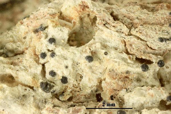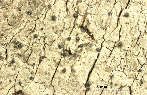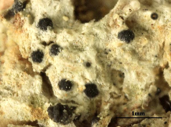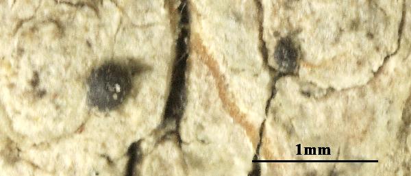 Description: Thallus crustose, endosubstratic, whitish or pale greenish grey, thin, smooth, ecorticate. Perithecia black, 0.3-0.6 mm across, half-immersed, the projecting part hemispherical. Involucrellum brown-black, completely surrounding a globose, colourless or pale brownish exciple; hamathecium of persistent, slender, sparingly branched, long-celled pseudoparaphyses, periphyses absent; hymenial gel I-, K/I-. Asci 8-spored, narrowly cylindrical, K/I-, fissitunicate, the apical dome with a broad ocular chamber surmounted by a hemispherical structure, with uniseriately arranged spores. Ascospores 1-septate, hyaline, ellipsoid with rounded ends, (9-)11-16.5 x 5-9.5 μm, surrounded by a perispore which appears verrucose in water, smooth in K. Pycnidia unknown. Photobiont trentepohlioid. Spot tests: K-, C-, KC-, P-, UV-. Chemistry: without lichen substances.Note: a mild-temperate, incompletely holarctic species of smooth bark in humid deciduous forests. Rare throughout the country, but most frequent in Tyrrhenian Italy.