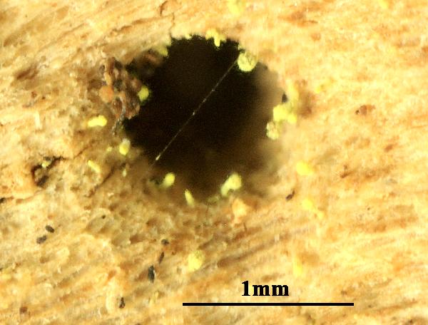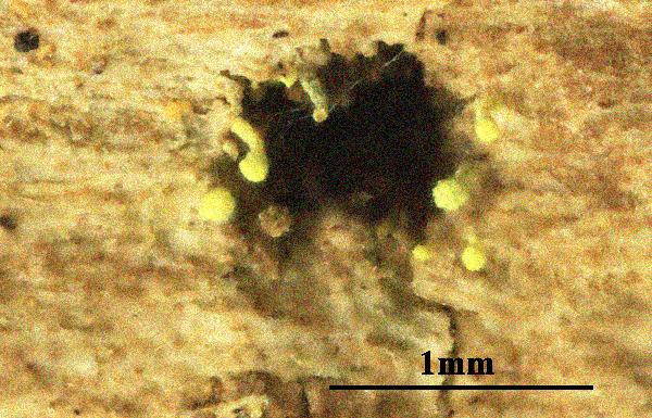 Description: Thallus crustose, endosubstratic and poorly visible. Apothecia stalked, pin-like, the stalk slender, 0.4-1.4 mm high, 0.04-0.08 mm thick, densely yellowish green-pruinose except sometimes in the black lowermost part, the inner part of periclinally arranged, medium brown hyphae, the outer part of dark brown, sclerotized hyphae. Capitulum spherical, 0.1-0.2 mm across, yellowish-green-pruinose, with a poorly developed excipulum of periclinally arranged hyphae, continuous with the stalk tissue and often reduced to a small basal collar. Mazaedium well-developed, dark to medium brown, but usually greenish-pruinose at least in young stages; hypothecium dark brown, with a convex upper surface. Asci cylindrical or irregular, formed in chains, dissolving early. Ascospores 1-celled, medium brown, globose to cuboid, 3-4.5 µm wide, the wall with a very minute ornamentation of tiny ridges and conspicuous, larger irregular cracks. Photobiont chlorococcoid, with rectangular cells (Stichococcus). Spot tests: thallus K-, C-, KC-, P-. Chemistry: thallus and pruina of the apothecia with pulvinic and vulpinic acids.Note: on decorticated stumps of deciduous and coniferous trees, more rarely on bark and siliceous rocks in old humid forests, on faces slightly protected from rain. Reported from both the Alps and the Apennines, but rare. It is included in the Italian red list of epiphytic lichens as “Endangered” (Nascimbene & al. 2013c).