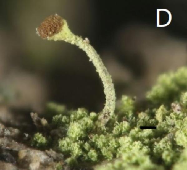 Description: Thallus subleprose, usually well-developed, thick, diffuse and poorly delimited, yellowish green, consisting of a thick mat of minute soredia-like granules. Apothecia rather frequent, stalked, pin-like, the stalk 1.6-2.6 mm tall and 0.06-0.1 mm thick, yellowish-green-pruinose at least in upper part. Capitulum hemispherical to globose, 0.1-0.2 mm across, with a pale brown, more or less greenish-pruinose mazaedium. Exciple very poorly developed to absent; hypothecium pale brown, with a strongly convex, knob-like upper surface, consisting of intricately interwoven hyphae, that are slightly sclerotized towards the surface. Asci 8-spored formed in chains, disintegrating early. Ascospores 1-celled, pale brown, globose to cuboid, 2.3-3 µm wide, the wall with a minutely verrucose surface and 5-6 reticulated ornamentation ridges over the hemisphere. Conidiomata hyphomycetous, of dispersed, more or less erect, colourless macronematous conidiophores. Conidia ellipsoid, hyaline, simple, arranged in chains. Photobiont chlorococcoid, with elongated cells arranged in chains (Stichococcus). Spot tests: thallus K-, C-, KC-, P-, UV+ pink. Chemistry: vulpinic and pulvinic acids, pulvinic dilactone.Note: a widespread and locally common holarctic lichen found beneath overhanging faces protected from rain, especially in forests, often on exposed roots but rather indifferent to the substrata (also found on siliceous rocks and lignum); in the Mediterranean belt it is restricted to very humid forests. The very similar, semi-cryptic C. eufuracea could be also present in Italy.
