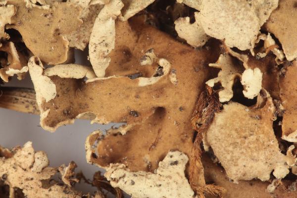 Description: Primary thallus squamulose, the squamules large, 6-40 mm long, 2-20 mm wide, sometimes with black or white hairs at the margins, persistent, forming more or less dense, 4-10 cm broad mats, the upper surface yellowish green to greenish-grey above, the lower surface cream-coloured or more rarely white, finely arachnoid. Podetia very rare, hollow inside, up to 1.5(-2) cm tall, with irregular cups, the surface corticate, smooth, very rarely with squamules on the margin of cups. Apothecia pale brown, convex, often confluent. Asci 8-spored, clavate, thickened at apex, with a K/I+ blue tholus and a K/I+ strongly blue outer gelatinous sheath, Cladonia-type. Ascospores 1-celled, hyaline, ellipsoid. Pycnidia frequent on the primary squamules or at the margins of cups, sessile to prominent, with a colourless jelly. Conidia hyaline, curved. Photobiont chlorococcoid. Spot tests: K- or K+ yellowish slowly turning brown, C-, KC+ yellowish, P+ red, UV-. Chemistry: fumarprotocetraric and usnic acids, rarely with additional psoromic acid, frequently with traces of zeorin.Note: a mild-temperate lichen found on both calcareous and siliceous soil in dry grasslands, or in intradunal depressions, also occurring in dry-continental Alpine valleys. The C. foliacea-C. convoluta complex was revised by Pino-Bodas & al. (2010): neither morphological characters nor phylogenetic analyses gave evidence to delimit two taxa.