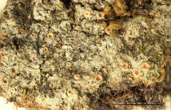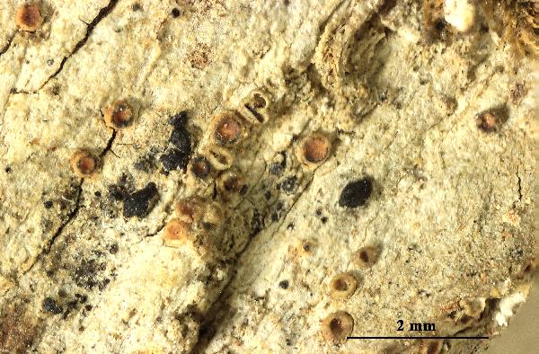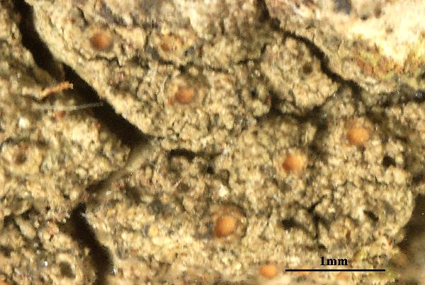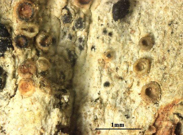 Description: Thallus crustose, inconspicuous, thin, pale green or grey, without a distinct prothallus. Apothecia scattered to aggregated, usually immersed, later sometimes becoming sessile, 0.2-0.5(-0.7) mm across, with a pale yellow-brown to pale orange or finally dark brown, deeply concave, waxy disc and a smooth to radially cracked, cream-coloured, brownish or yellowish pink proper margin which is sometimes covered by a thalline layer at the base. Proper exciple thick, colourless or pale brown in outer part; epithecium hardly differentiated from the hymenium; hymenium colourless, 90-115 µm high; paraphyses slightly longer than the asci, septate, capitate, the apical cells up to 3-4 µm wide; hypothecium colourless to pale yellow. Asci 8-spored, cylindrical to elongate-clavate, thin-walled, lacking an apical apparatus or tholus, the wall K/I+ blue. Ascospores muriform (with 6-12 cells visible in optical view) with (4-)5-7(-9) transverse septa and 1-2 longitudinal septa, most septa perpendicular to each other, hyaline, fusiform, without conical tips, 17-28(-31) x 7-9(-10) µm. Photobiont trentepohlioid. Spot tests: K-, C-, KC-, P-, UV-. Chemistry: without lichen substances.Note: a temperate lichen found on mature trees with base-rich bark, mostly Acer and Fraxinus, but also on the slightly nutrient-enriched bark of more acid-barked trees such as oaks, in mild-humid areas; more common in the past, presently localised in clearings of ancient, open, humid deciduous forests.