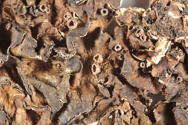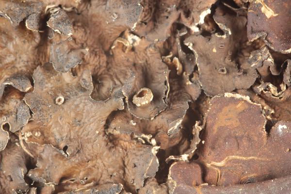 Description: Thallus foliose, heteromerous, dorsiventral, broad-lobed, forming very large, 10-20(-35) cm wide rosettes. Lobes (0.5-)1-1.5(-2.5) cm wide, with rounded and ascending, wavy margins, matt to slightly shiny in marginal parts, olive-brown to dark bluish green, turning green when wet, often warted or wrinkled in thallus center and white-pruinose at lobe tips, with numerous black dots (pycnidia) especially along the margins. Lower surface black-brown in central parts, pale brown at margins, with simple rhizines. Upper cortex paraplectenchymatous, with a pored epicortex, the cell walls containing isolichenan, N+ violet; medulla white; lower cortex paraplectenchymatous. Apothecia common, lecanorine, urceolate, 0.5-2 cm across, sessile to shortly stalked, with a concave to flat, brown disc and a wavy, strongly rugose thalline margin. Epithecium brown; hymenium and hypothecium colourless. Asci 8-spored, clavate, the K/I+ blue tholus penetrated by a faintly amyloid apical cushion with parallel or diverging flanks, the wall K/I-, surrounded by a K/I+ blue outer layer, Lecanora-type. Ascospores 1-celled, hyaline, ellipsoid, (10-)12-17 x (6.5-)7-9(-10.5) µm. Pycnidia common and often very abundant, laminal, immersed, appearing as black dots, globose in section, the wall colourless except around ostiole. Conidia colourless, bacilliform, 5-8 x c. 1 μm. Photobiont chlorococcoid. Spot tests: upper cortex: K- or K+ faintly yellow, C-, KC-, P-, N+ violet; medulla: K+ yellow turning red (needle-like crystals), C-, KC-, P+ orange, UV-. Chemistry: medulla with norstictic and connorstictic acids.