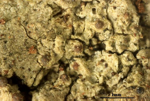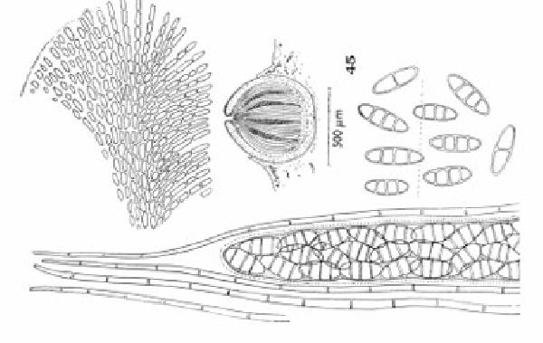 Description: Thallus crustose, very thinly episubstratic, forming irregular, poorly delimited, 1(-2) cm wide patches, continuous to slightly cracked, pale grey to pale brown, sometimes with a greenish tinge. Perithecia 0.3-0.6 mm across, pale pink brown to red-brown, tending to become darker with age, of a lighter colour around the ostiole, half-immersed in thallus, often surrounded at base by a thalline rim. Exciple prosoplectenchymatous, of intertwined hyphae with thick gelatinized walls, colourless within, brown in outer part, the innermost layer made of thin-walled hyphae; periphyses simple or sparingly branched, 4-5-celled, up to 35 μm long; paraphyses 1.5-2 μm thick, 250-350 μm long; hymenial gel non-amyloid. Asci 100-150-spored, cylindrical, tapering towards the apex, the wall thin, 1+ light blue, without a tholus. Ascospores (1-)3-septate, with rounded ends, hyaline, ellipsoid, 12-18 x 4-8 μm, with a very thin, often inapparent perispore. Photobiont trentepohlioid. Spot tests: thallus K-, C-, KC-, P-, UV-. Chemistry: without lichen substances.Note: a mild-temperate species found on old deciduous trees (e.g. Fagus, Quercus), especially near the base of the boles, in areas with high rainfall, mainly Tyrrhenian in Italy. It is included in the Italian red list of epiphytic lichens under the “Least Concern” category (Nascimbene & al. 2013c).