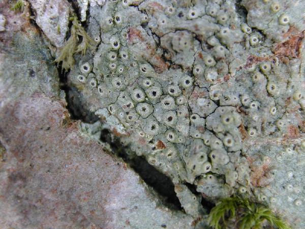 Description: Thallus crustose, smooth to rugose, whitish, pale grey or cream-coloured, usually rather thin, mainly continuous. Medulla white, densely packed with crystals of calcium oxalates. Apothecia usually numerous, evenly distributed, deeply immersed in prominent, conical thalline warts which are 1-2 mm diam. at the base, and have an open, 0.2-0.5 mm wide, crater-like summit, the rim usually incurved, with a whitish membrane at the bottom which disrupts at maturity, leaving small, white fragments in the center of the blackish apothecial disc surrounded by a prominent, black proper margin which is usually free from the thalline margin. Proper exciple visible from above as an internal ring, of densely conglutinated, short-celled hyphae; epithecium brownish; hymenium colourless, up to 200 µm high, non-amyloid; paraphyses slender, thread, like, mostly simple, periphysoids present, lining the upper inner surface of the exciple; hypothecium colourless. Asci 4(-8)-spored, subcylindrical, with a single functional wall layer, abruptly thickened at apex, K/I-. Ascospores muriform, with 10-19 transverse and 1-5 longitudinal septa, hyaline, fusiform, (30-)60-130(-150) x (10-)15-25(-33) µm, I- or I+ weakly purplish. Photobiont trentepohlioid. Spot tests: K-, C-, KC-, P-, UV-. Chemistry: without lichen substances.Note: a mild-temperate lichen found on the bark of Fagus and Abies, more rarely of other broad-leaved trees in humid montane forests with frequent fog or near rivers, exceptionally occurring in evergreen Mediterranean, coastal-humid forests. It is included in the Italian red list of epiphytic lichens as “Near-threatened” (Nascimbene & al. 2013c).