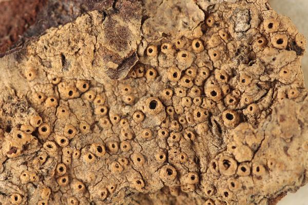 Spain, Moal (Cangas de Narcea), 28-VI-2022, en corteza de Quercus petraea, leg. M. González, det. J. Etayo & M. González, ERD-9431.