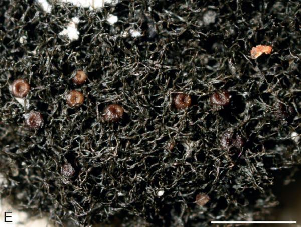 Description: Thallus minutely filamentous, forming up to 1 cm wide mats or flattened pillows on the rock, consisting of 10-12(-15) µm thick, simple or branched, brown-black, more or less ascending filaments without a central strand, each filament including a row of cells of Scytonema, whose gelatinous sheath is loosely infected with a few elongated hyphae, some of which usually produce haustoria that penetrate the cyanobacterial cells. Apothecia biatorine pycnoascocarps, 0.2-0.5 mm across, arising laterally on the filaments, dark reddish brown, with a concave, poriform disc, and a thick proper margin. Proper exciple of loosely intertwined hyphae, brown in outer part, colourless within; hymenium 100-150 µm high, colourless or brownish in upper part, K/I+ blue; paraphyses simple, thickened at apex; hypothecium colourless. Asci 8(-12)-spored, cylindrical, thin-walled, K/I+ blue. Ascospores 1-celled, hyaline, ellipsoid, 9-15 x 5-8 µm. Pycnidia arising laterally on the filaments, with a reddish brown ostiole. Conidia globose, formed terminally on the conidiophores, 1-2 μm wide. Photobiont cyanobacterial (Scytonema), the cells arranged in chains, 9-15 x 6-7 µm; photobiont trichomes with false branching, i.e. cell divisions exclusively anticlinal; when the photobiont trichome splits, the formerly connected ends start growing independently to form V-shaped branching (visible at least in younger parts of the thallus); trichomes often paired, but tips free and diverging. Spot tests: all negative. Chemistry: without lichen substances. Note: on calciferous or base-, often mineral-rich siliceous rock, in sun-exposed seepage tracks with colonies of cyanobacteria, mostly in upland areas but usually below treeline.