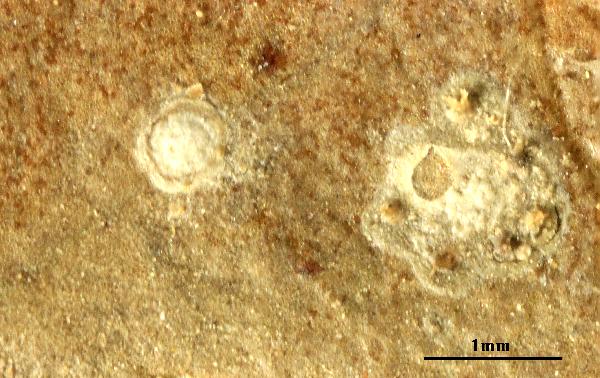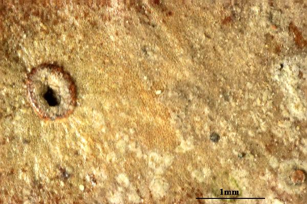 Description: Thallus crustose, thinly episubstratic, forming c. 1 mm wide, often confluent, whitish to grey, orbicular patches on the leaves of Buxus. Apothecia lecideine, usually 1(-2) per thalline patch, 0.3-0.35 mm across, with a pale brown to reddish brown, concave to flat disc, and a raised, usually darker proper margin. Proper exciple of radially arranged hyphae; epithecium colourless to brownish; hymenium colourless, I+ yellowish to reddish brown; paraphyses simple, free or partially bound with the asci in a gelatinous matrix, 1-1.5 µm thick, not thickened at apex; hypothecium colourless. Asci 8-spored, narrowly clavate, thin-walled, apically thickened, the wall I-. Ascospores (1-)3-6-septate, hyaline, narrowly ellipsoid, (11-)15-19(-24) x 5-7 µm. Photobiont chlorococcoid. Spot tests: thallus K-, C-, KC-, P-, UV-. Chemistry: without lichen substances.Note: a foliicolous species described from Africa, and also known from the Pyrenees; in the only Italian station, a warm-humid coastal valley, it was found on the leaves of Laurus. It is included in the Italian red list of epiphytic lichens as “Critically Endangered” (Nascimbene & al. 2013c).