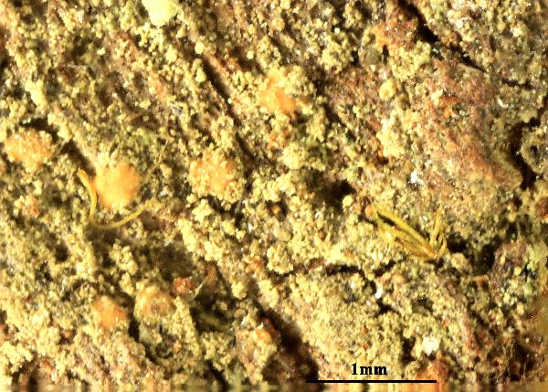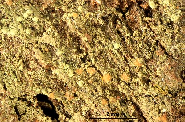 Description: Thallus crustose, endosubstratic or thinly episubstratic, poorly delimited, green to brownish green, when best developed of more or less scattered, up to 1.5 mm wide, sorediate areoles. Soralia punctiform, 0.1-0.25(-0.4) mm across, usually discrete but sometimes confluent, strongly convex, pale brown to pale greenish brown, with farinose soredia. Apothecia very rare, lecideine, sessile, up to 0.2 mm across, with a concave to flat, pinkish brown disc, and a very thin, paler proper margin. Proper exciple of colourless hyphae embedded in a colourless to weakly pigmented gel; epithecium almost colourless to pale yellowish brown; hymenium colourless, 90-140 μm high; paraphyses coherent, thin, densely branched and anastomosing, not thickened at apex; hypothecium colourless. Asci 8-spored, cylindrical-clavate, unitunicate, thin-walled, the apical dome K/I-, or weakly K/I+ blue, Trapelia-type. Ascospores 1-celled, hyaline, ellipsoid, 11-14 x 5-6.5 μm. Photobiont chlorococcoid. Spot tests: soralia K-, C+ red, KC+ red, P-, UV+ white. Chemistry: gyrophoric acid (major), and traces of lecanoric and 5-O-methylhiascic acids.