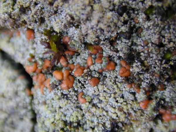 Description: Thallus crustose, episubstratic, whitish, pale grey or rarely pale ochre, thick, areolate, granulose. Areoles convex, contiguous, granular to verrucose, to 0.5 mm in diam., the marginal ones often somewhat elongate. Soredia diffuse, granular, whitish to brownish yellow or with a faint pinkish hue, sometimes absent. Apothecia frequent, lecideine, sessile, up to 1.5 mm across, often of different colours on the same thallus, varying from pale pink, reddish brown, dark grey-green or almost black, with an initially flat, then rapidly convex disc, and a thin, flexuose proper margin. Proper exciple grey or colourless in outer part, grey to brown within, of densely entangled hyphae; epithecium pale grey to brown; hymenium colourless or yellowish, 50-80 μm high; paraphyses coherent, 1-2.5 μm thick, slender, branched and anastomosing, only slightly thickened at apex; hypothecium colourless to pale brown. Asci 8-spored, clavate-cylindrical, thin-walled, I+ pale blue, with a small I+ blue cap inside the thickened apex. Ascospores 1-celled, hyaline, ellipsoid, thick-walled, 8-15 x 4-7 μm. Photobiont chlorococcoid. Spot tests: thallus and soredia K-, C+ pink, KC+ pink, P-, UV+ bluish white. Chemistry: gyrophoric acid.Note: an arctic-alpine to cool-temperate, circumpolar lichen mostly found on rotting wood, more rarely on soil rich in humus, bryophytes and peat, mostly in clearings of grasslands and scrublands, with optimum near treeline; most common in the Alps, much rarer in the Apennines.
