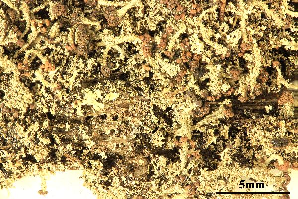 Description: Primary thallus squamulose, persistent, the squamules whitish to pale greenish grey, white beneath, 1-3(5) mm long, 0.2-1(-2) mm broad, very finely divided and often with an almost coralloid appearance, granulose along the margins. Podetia rather rare, hollow inside, whitish grey to pale grey-brown, 1-10(-20) mm tall, deformed and very irregularly branched, fissured, with gaping holes, often covered by isidioid granules and partly decorticated, with scattered to usually numerous, small, dichotomously divided squamules. Apothecia rare, dark brown, convex, often clustered. Asci 8-spored, clavate, thickened at apex, with a K/I+ blue tholus and a K/I+ strongly blue outer gelatinous sheath, Cladonia-type. Ascospores 1-celled, hyaline, ellipsoid. Pycnidia dark, semi-immersed in the upper part of squamules, with a colourless jelly. Conidia hyaline, curved. Photobiont chlorococcoid. Spot tests: K+ yellow, C-, KC-, P+ yellow-orange, UV-. Chemistry: thamnolic acid and variable amounts of barbatic acid, the latter only in the apothecia. Note: a mainly temperate, probably holarctic species, normally lignicolous, on stumps, sometimes on basal parts of old trunks, with optimum in old Castanea-stands.