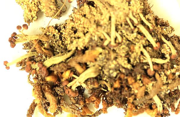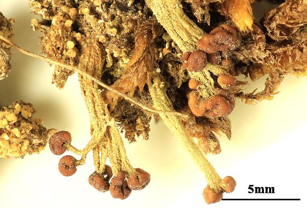 Description: Primary thallus squamulose, persistent, the squamules very small, 1.2-2 mm long, 1.4-2 mm wide, granule-like to rounded and ear-shaped, with a more or less entire margin, often contiguous and forming flat crusts of convex areoles, yellowish green on upper side, white beneath. Podetia uncommon, pale greenish grey, 0.5-1.5(-2.5) cm tall, 0.3-0.8(-1.5) mm thick, hollow inside, usually simple or with a few apical branchlets, blunt and cupless, longitudinally grooved and cracked, almost continuously areolate-corticate and verruculose, sometimes sparsely squamulose at base. Apothecia frequent, brown, convex, terminal, often coalescing into 1-3 mm wide aggregations. Asci 8-spored, clavate, thickened at apex, with a K/I+ blue tholus and a K/I+ strongly blue outer gelatinous sheath, Cladonia-type. Ascospores 1-celled, hyaline, ellipsoid. Pycnidia dark, subsessile, developing on the primary squamules, with a colourless jelly. Conidia hyaline, curved. Photobiont chlorococcoid. Spot tests: K- or K+ yellowish slowly turning brown, C-, KC-, P+ rapidly red, UV-. Chemistry: fumarprotocetraric acid complex. Note: a mainly temperate lichen found on soil in open woodlands (oak, pine) and Calluna-heaths, in areas with siliceous substrata, perhaps overlooked in Italy.
