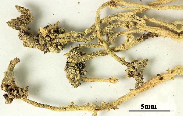 The image shows the extreme variability of C. ramulosa: no apothecia; scyphi irregular, with marginal proliferations; podetia with squamules.