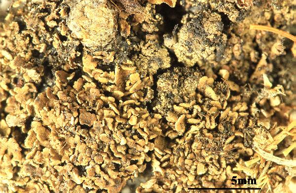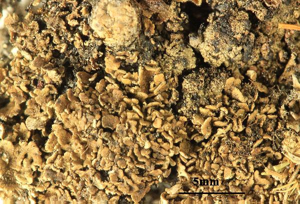 Description: Primary thallus squamulose, the squamules persistent, prominent, stiff, elongate-crenate, up to 5 mm long, 0.5-3.5 mm wide, grey-green to bronze-green above, white and corticate beneath, forming dense, often convex, up to 10 cm wide (usually smaller) cushions. Podetia rather rare, small, 0.3-0.8(-1) cm tall, 1-3 mm thick, greenish brown to yellowish brown, irregularly cylindrical to clavate, cupless, continuously corticate, sometimes with small cracks, often squamulose at the base. Apothecia normally present when podetia are well-developed, brown, convex, usually forming aggregates. Asci 8-spored, clavate, thickened at apex, with a K/I+ blue tholus and a K/I+ strongly blue outer gelatinous sheath, Cladonia-type. Ascospores 1-celled, hyaline, ellipsoid. Pycnidia brown, semi-immersed in the basal squamules, with a colourless jelly. Conidia hyaline, curved. Photobiont chlorococcoid. Spot tests: K-, KC-, C+ bright emerald green, P+ yellow, UV+ whitish. Chemistry: baeomycesic and squamatic acids, strepsilin, sometimes traces of barbatic and 4-O-demethylbarbatic acids.Note: a boreal-montane to tropical lichen found on humus-rich soil overlaying siliceous rocks and amongst bryophytes in humid depressions periodically filled by water, in open situations; probably restricted to the Alps in Italy.
