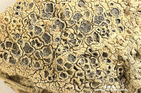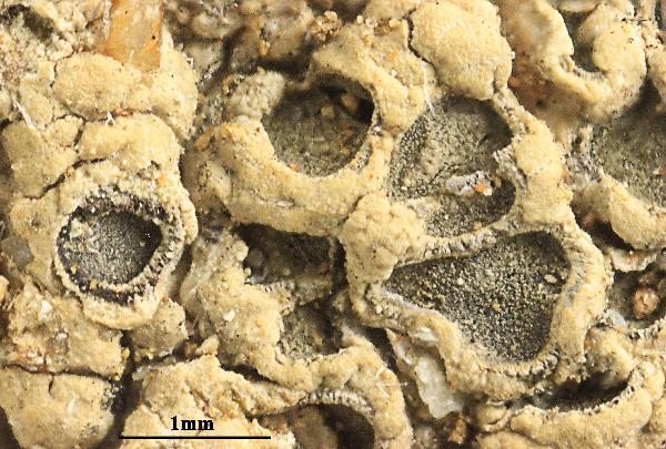 Description: Thallus crustose, episubstratic, rimose- to verrucose-areolate, whitish to grey, consisting of irregularly angular, 0.5-2.5 mm wide and 1-3 mm thick, flat to convex, dull, usually pruinose areoles. Epinecral layer to c. 50 µm thick; algal layer continuous, well developed; medulla white, with scattered, small calcium oxalate crystals, I- or rarely I+ blue. Apothecia lecanorine, urceolate, semi-immersed to sessile, up to 2.5 mm across, with a black, but often slightly grey-pruinose, concave disc, and a thick thalline margin. Proper exciple blackish brown, 60-80 µm wide laterally, pseudoparenchymatous; epithecium poorly differentiated, colourless to brownish; hymenium colourless, 110-180 µm high, non amyloid; paraphyses simple, flexuose, 1-2 µm thick, the apical cells not swollen; hypothecium brown, c. 15 m high. Asci (4-)8-spored, narrowly clavate to subcylindrical, the wall evenly thickened when mature, the somewhat abrupt apical thickening with a thin, internal apical beak, lacking any apical apparatus, the contents I+ orange-red, the walls I-, not fissitunicate. Ascospores muriform, with 3-6 transverse and 1-2 longitudinal septa, at first hyaline then turning brown, broadly ellipsoid, 20-38(-40) x 9-17 µm; Pycnidia black, immersed in thallus, hyaline to brownish, cerebriform. Conidia bacilliform, 4-6 x 1-1.5 µm. Photobiont chlorococcoid. Spot tests: K- or K+ yellow to red, C+ red, KC- or KC+ red, P-, UV-. Chemistry: diploschistesic and lecanoric acids (both major) and orsellinic acid (minor). Note: a widespread species of arid grasslands, found on calciferous or base-rich soil, especially on gypsum, in open, dry situations; perhaps more widespread throughout the country. D. neutrophilus was originally segregated from D. diacapsis on account of its different ecology (it grows on neutral sandy to clay soil) and the amyloid reaction of the medulla, a character not confirmed by Fernández-Brime & al. (2013), although their molecular data indicated that this, in spite of the very weak morphological differences, could be a distinct species, differing from the calcicolous D. diacapsis. However, data by Zhao & al. (2017) suggest that D. neutrophilus should be best considered as a synonym of D. diacapsis.
