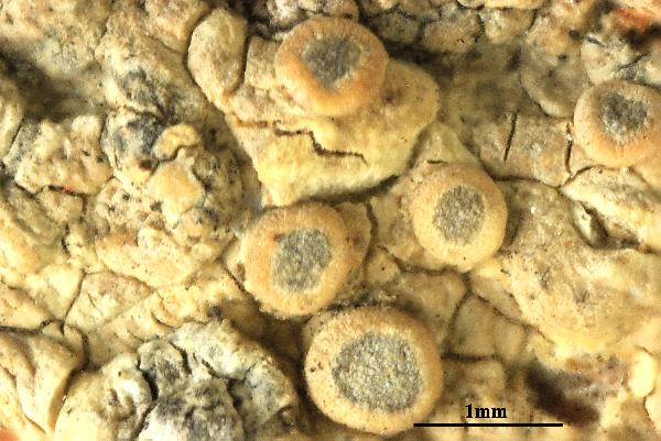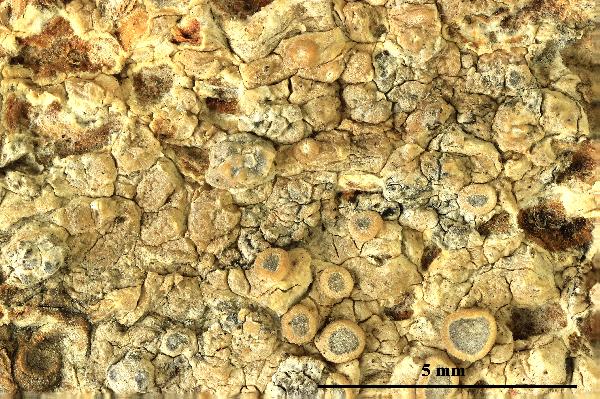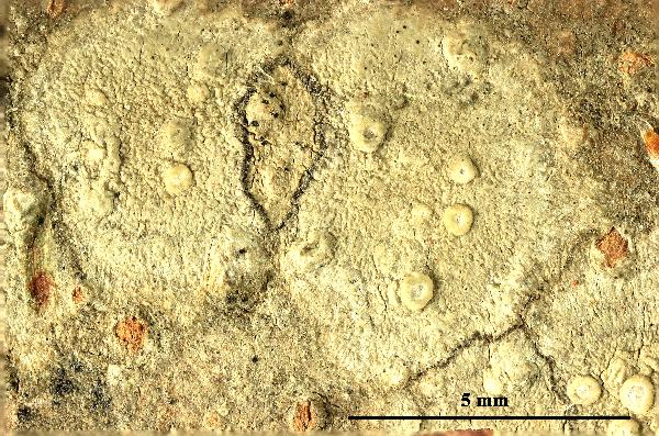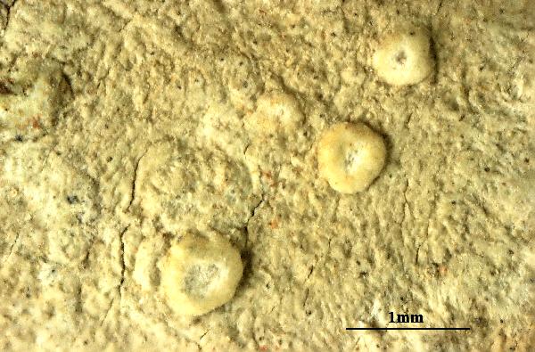 Description: Thallus crustose, episubstratic, continuous to rimose-areolate, smooth to verruculose, creamy white, greenish white or pale pinkish brown, sometimes slightly pruinose, 0.1-1.5 mm thick, often delimited by a whitish prothallus. Cortex 40-60 µm thick, with anticlinally arranged, colourless hyphae immersed in a pale yellow-brown gelatinous matrix, without crystals; medulla chalk-white, with loose, sometimes almost byssoid hyphae near the substratum. Apothecia lecanorine, sessile, constricted at base, round to angular in outline, 0.5-4 mm across, with a dark-grey to grey-black, but usually densely white-pruinose disc, and a thick, often wavy proper margin. Proper exciple inconspicuous; epithecium brownish, with crystals visible under polarized light; hymenium colourless, often interrupted by thin, vertical, dark hyphal strands; paraphysoids unbranched or sparsely branched, 1-2 µm thick, the apical cells 2-3 µm wide; hypothecium thick, black. Asci 8-spored, clavate, bitunicate, the apex thickened with a small internal K/I+ blue ring. Ascospores 3-septate, hyaline, fusiform, straight or slightly curved, 21-26 x 4-5 µm. Pycnidia black, immersed or slightly protruding. Conidia thread-like, sickle-shaped. Photobiont trentepohlioid. Spot tests: thallus K- C+ red, KC+ red, P-, UV-; medulla C-; apothecial disc C+ faintly red or C-. Chemistry: erythrin, lecanoric acid, plus an unidentified substance.Note: D. ceratoniae and D. massiliensis have been extensively studied from the molecular point of view, with numerous samples taken all over their respective distribution areas (Tehler & al. 2013). This showed that D. ceratoniae is not only corticolous, but quite frequently saxicolous as well. Mostly, the saxicolous specimens can be morphologically distinguished from the strictly saxicolous D. massiliensis. However, there are cases where saxicolous specimens of the two species are virtually indistinguishable without DNA data (Tehler in litt.). It is included in the Italian red list of epiphytic lichens under the “Least Concern” category (Nascimbene & al. 2013c).